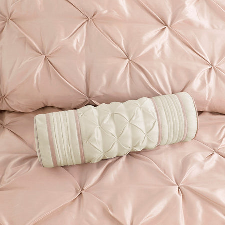 This beautifully tufted bed is from the Laurel Bedding Collection. It's gorgeous, soft blush color makes this set easy to accessorize your bedroom. The collection is made from 100% polyester polyoni and has pieced fabric sewn together to give this set dimension. It is finished with a smooth edge of fabric that creates a beautiful border around this comforter. Items in the set may come in a rolled or compressed packaging, which will need to be fluffed up or steam ironed before use to remove wrinkles.