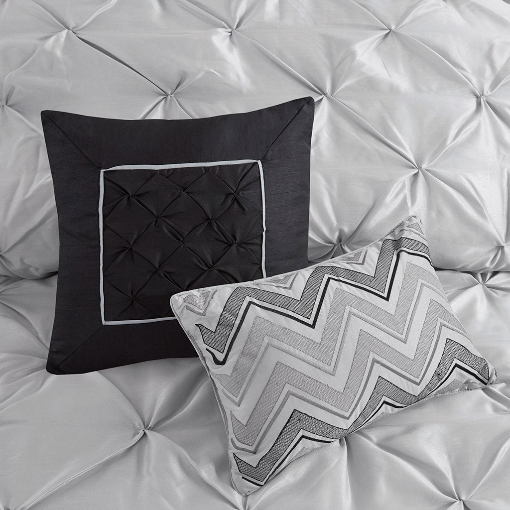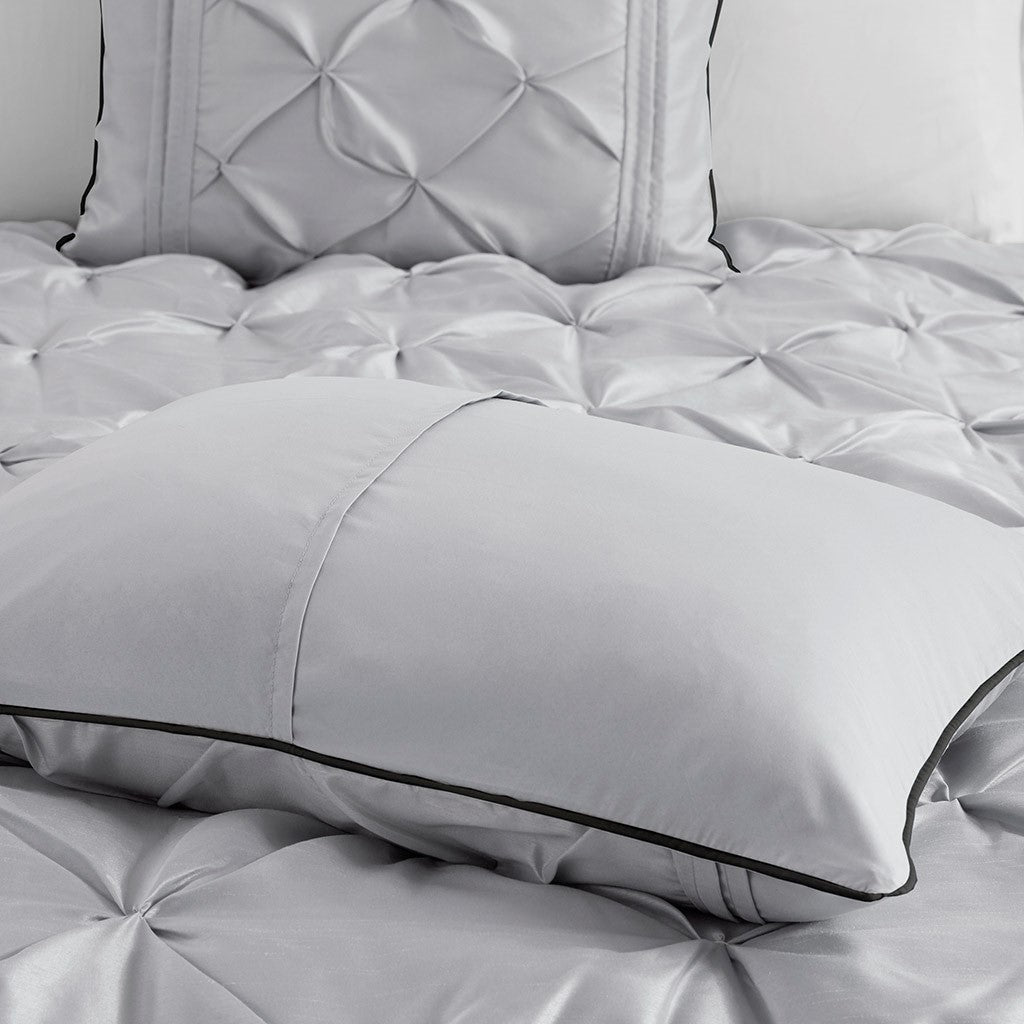 This beautifully tufted bed is from the Laurel bedding collection. Its grey coloring makes this set create a statement in your bedroom. The collection is made from 100% polyester polyoni and has pieced fabric sewn together providing added dimension. It is finished with a smooth edge of fabric that creates a beautiful border around this comforter. Items in the set may come in a rolled or compressed packaging, which will need to be fluffed up or steam ironed before use to remove wrinkles.