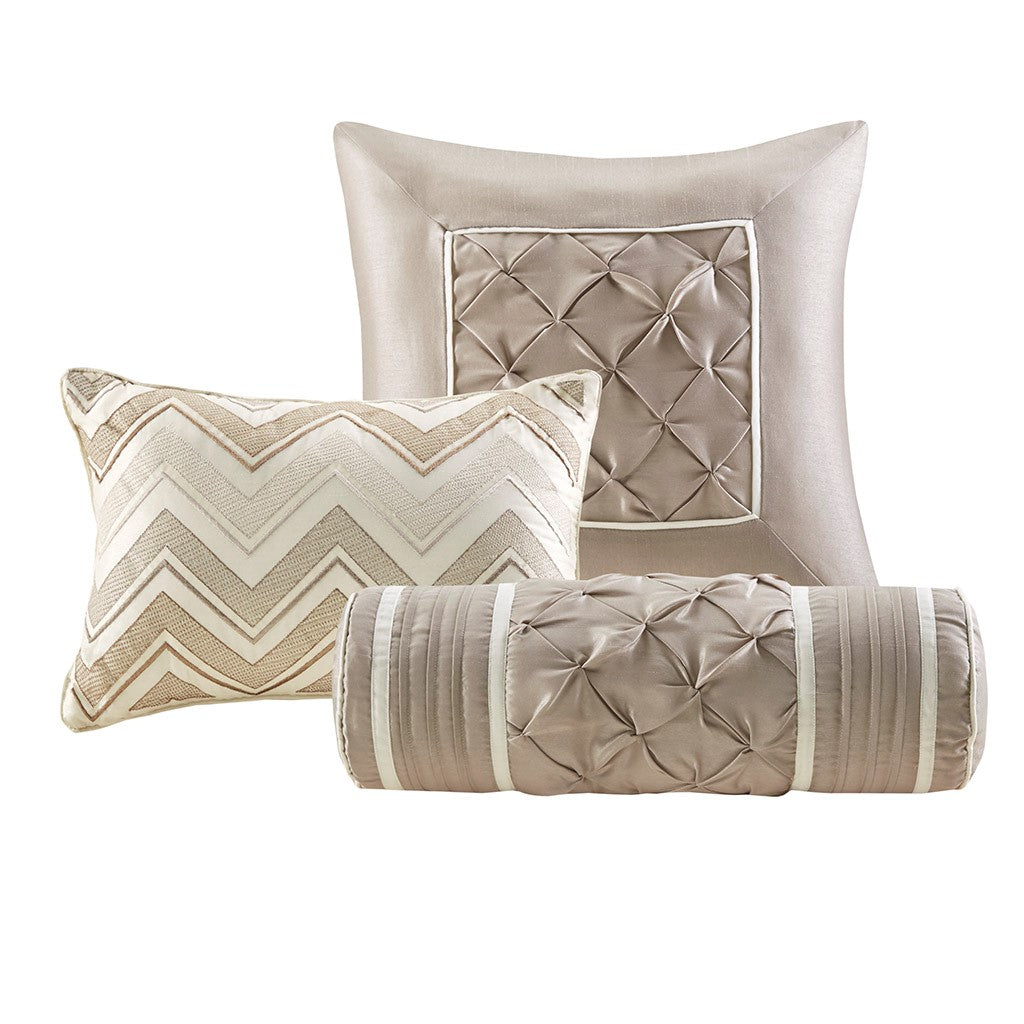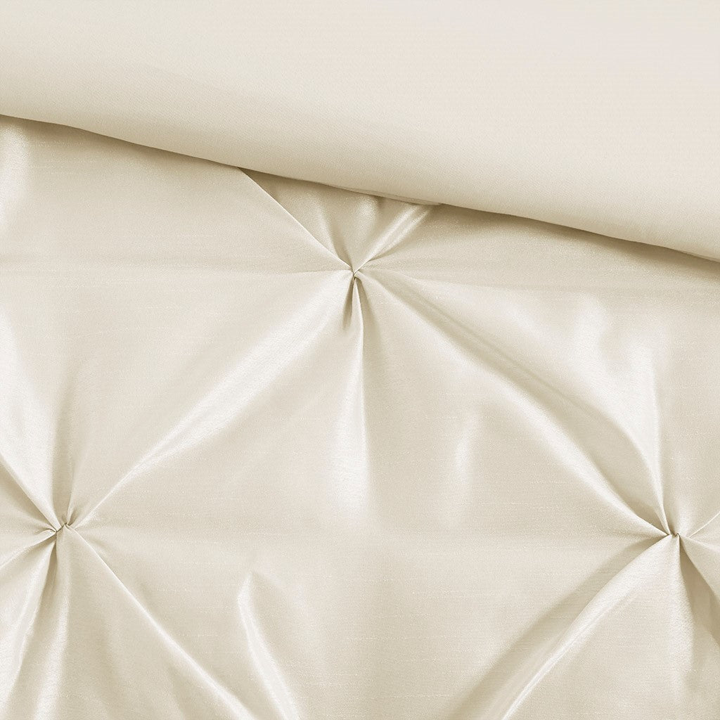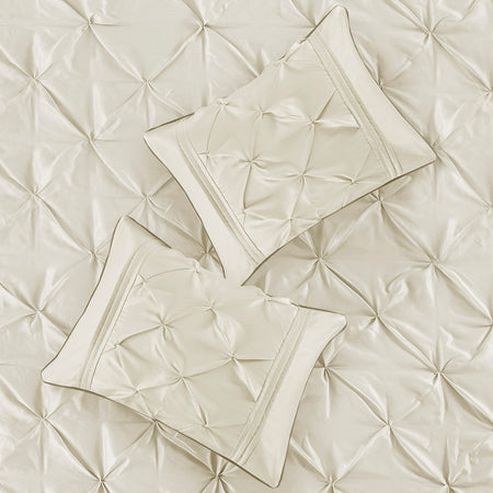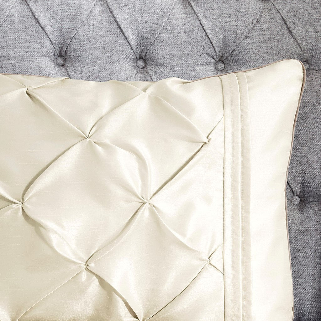 This beautifully tufted bed is from the Laurel bedding collection. Its ivory coloring makes this set easy to accessorize in your bedroom. The collection is made from 100% polyester polyoni and has pieced fabric sewn together to give this set added dimension. It is finished with a smooth edge of fabric that creates a beautiful border around this comforter. Items in the set may come in a rolled or compressed packaging, which will need to be fluffed up or steam ironed before use to remove wrinkles.