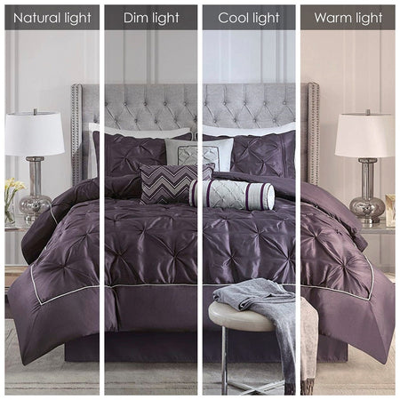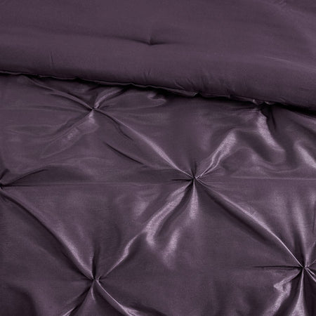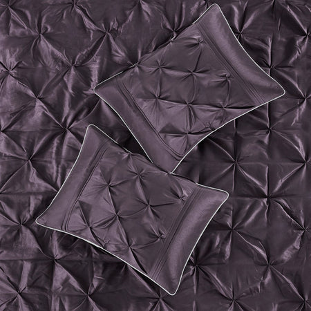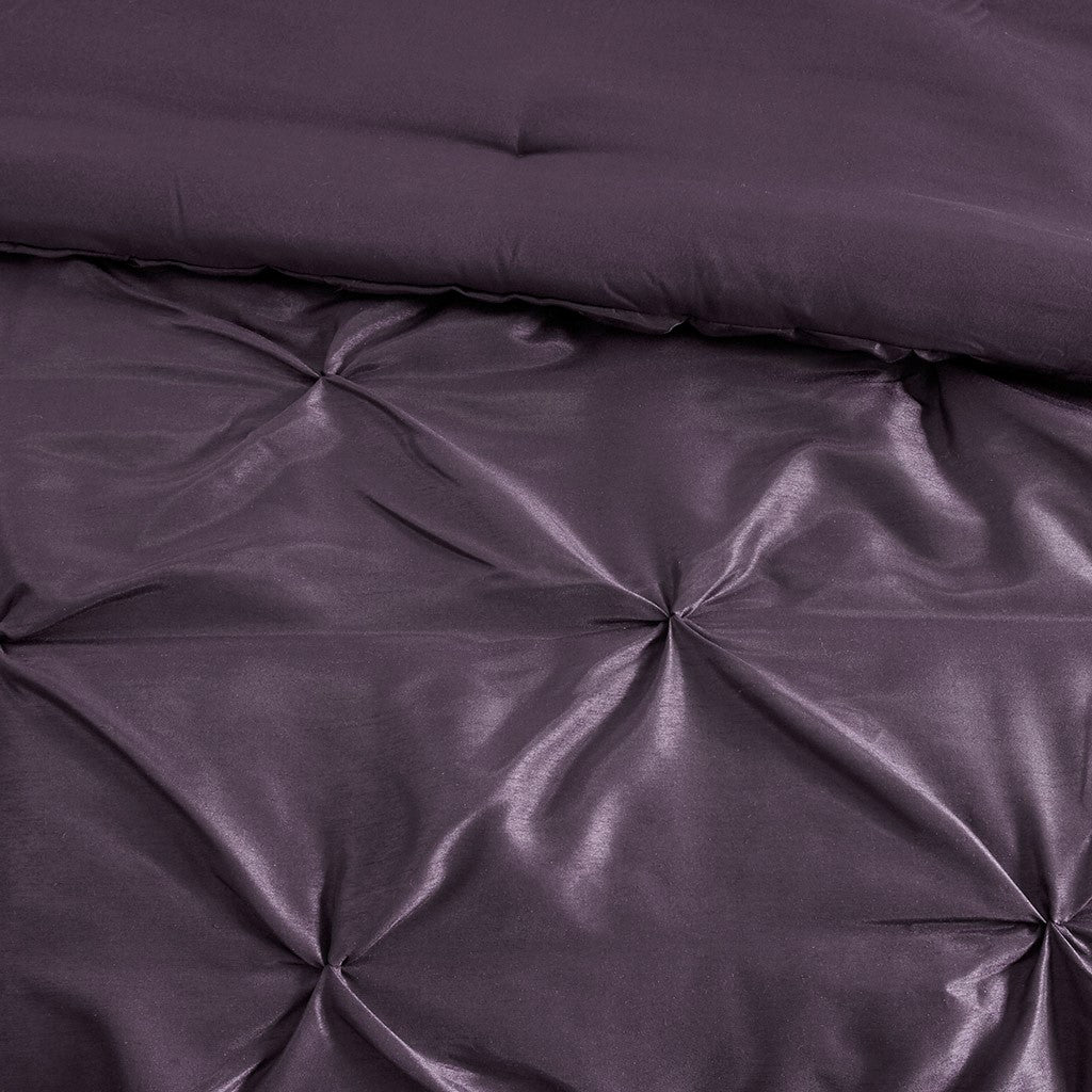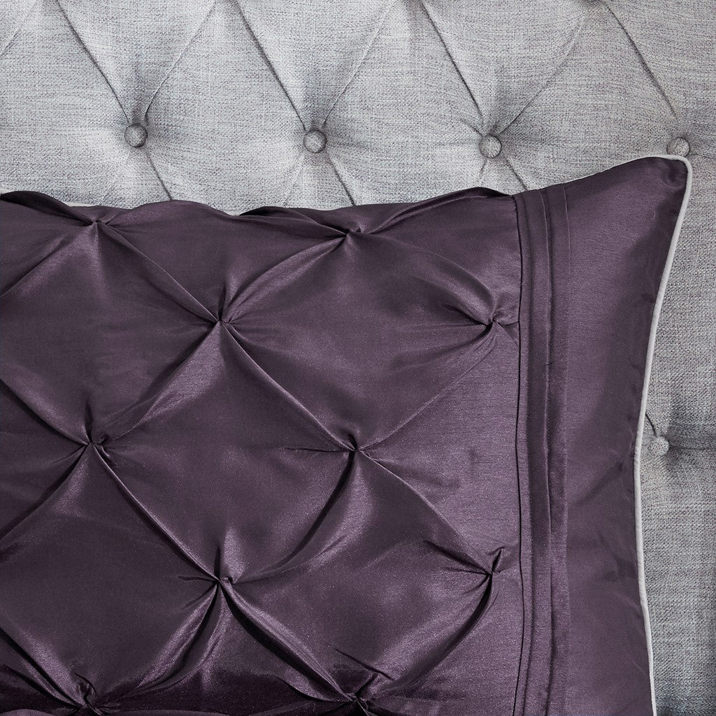 This beautifully tufted bed is from the Laurel bedding collection. Its deep plum coloring makes this set create a statement in your bedroom. The collection is made from 100% polyester polyoni and has pieced fabric sewn together to give this set dimension. It is finished with a smooth edge of fabric that creates a beautiful border around this comforter. Items in the set may come in a rolled or compressed packaging, which will need to be fluffed up or steam ironed before use to remove wrinkles.