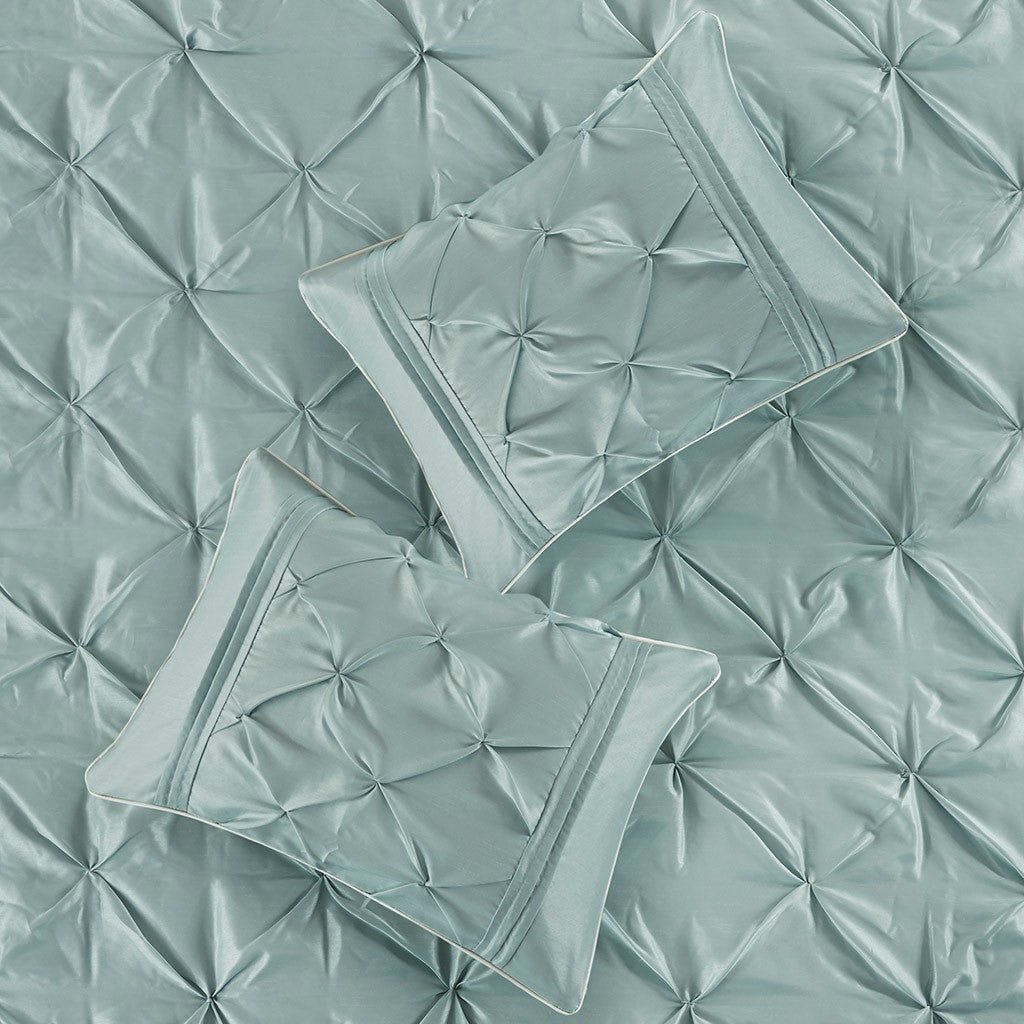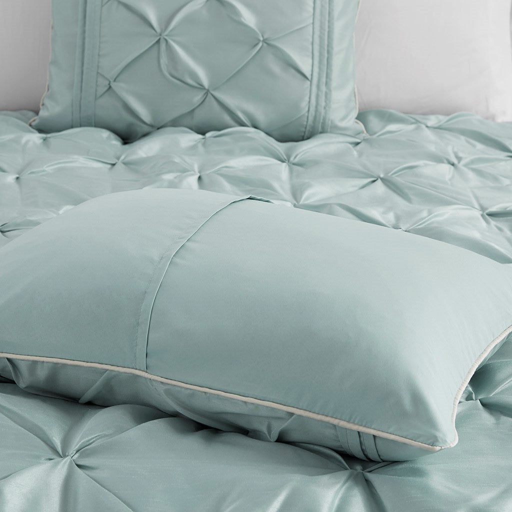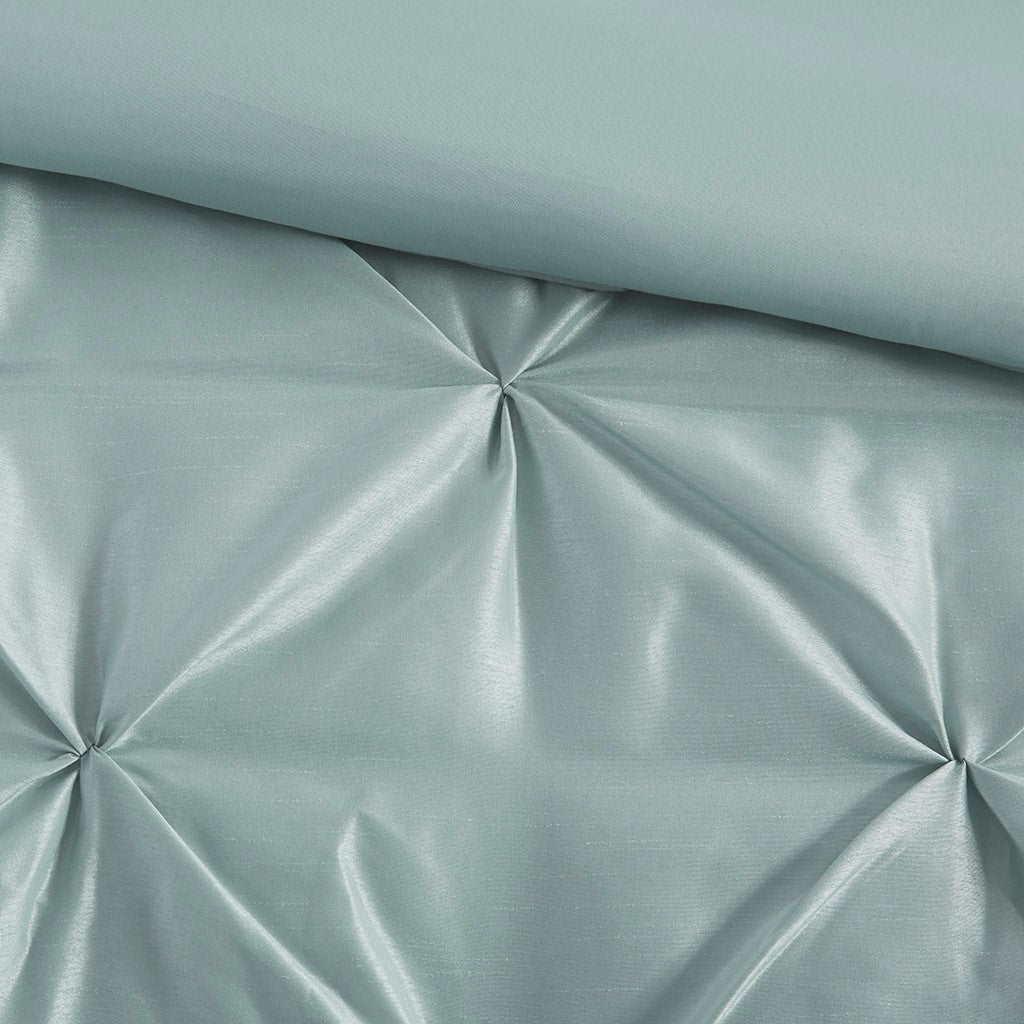 This beautifully tufted bed is from the Laurel bedding collection. Its seafoam coloring makes this set easy to accessorize in your bedroom. The collection is made from 100% polyester polyoni and has pieced fabric sewn together to give this set added dimension. It is finished with a smooth edge of fabric that creates a beautiful border around this comforter. Items in the set may come in a rolled or compressed packaging, which will need to be fluffed up or steam ironed before use to remove wrinkles.