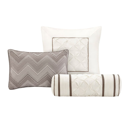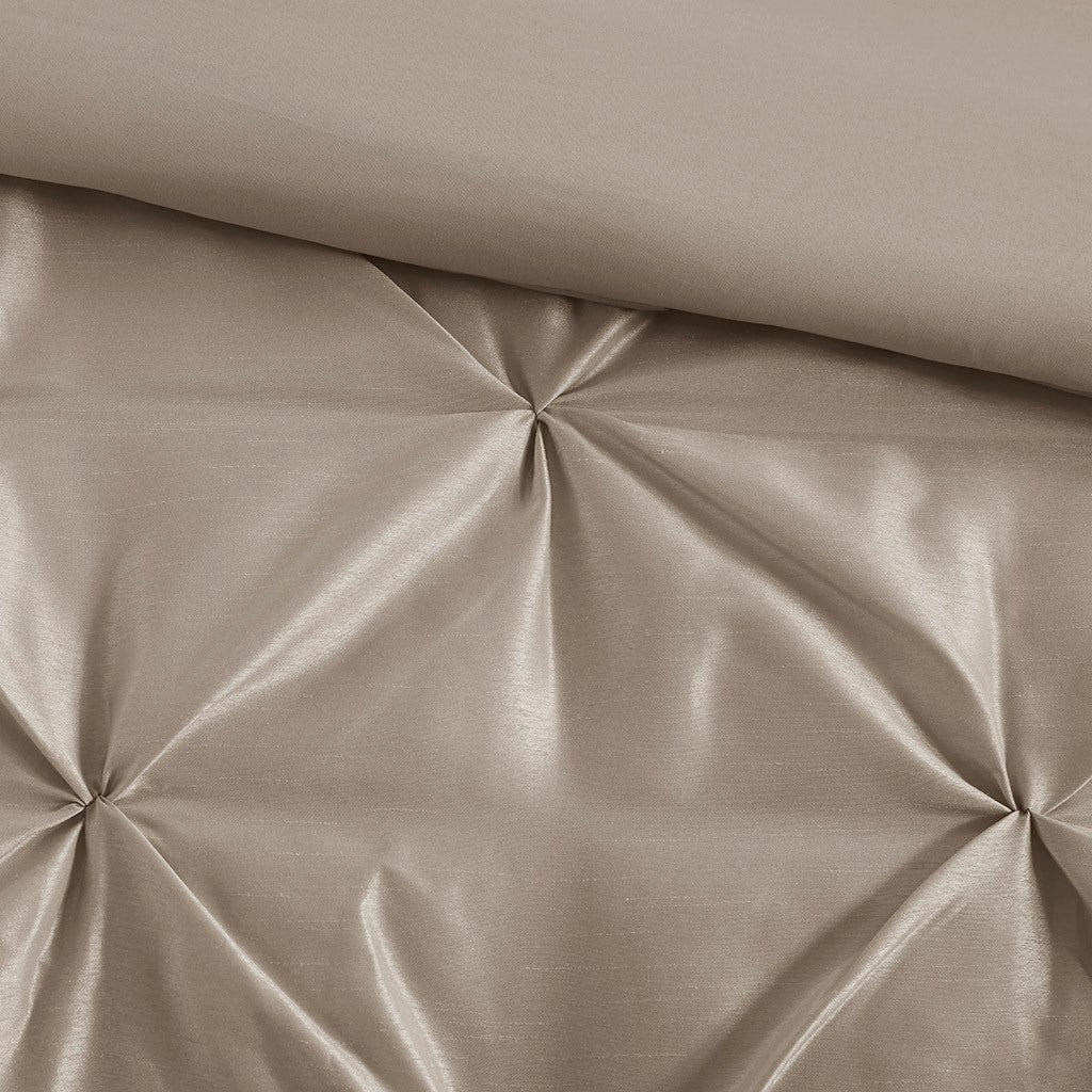 This beautifully tufted bed is from the Laurel bedding collection. Its neutral taupe coloring makes this set easy to accessorize in your bedroom. The collection is made from 100% polyester polyoni and has pieced fabric sewn together to give this set dimension. It is finished with a smooth edge of fabric that creates a beautiful border around this comforter. Items in the set may come in a rolled or compressed packaging, which will need to be fluffed up or steam ironed before use to remove wrinkles.