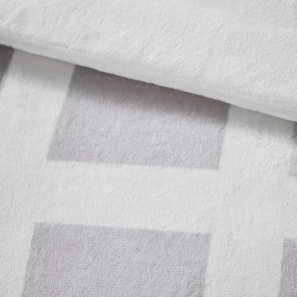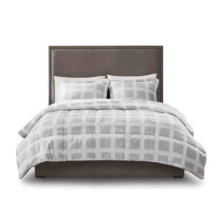 Sleep soundly in the pure plush comfort of the Madison Park Mae Plush Comforter Set. The comforter features a grey geometric print on the plush face with a solid white reverse to create luxurious look and feel. Matching shams (1 for Twin Sizes) coordinate perfectly with the plush reversible comforter, while box sewn quilting on the comforter keeps the filling in place. Ultra-soft for a cozy night's sleep, this reversible comfort set is sure to keep warm through the night and is machine washable for easy care. This comforter set is also OEKO-TEX certified, meaning it does not contain any harmful substances or chemicals to ensure quality comfort and wellness. Items in the set may come in a rolled or compressed packaging, which will need to be fluffed up or steam ironed before use to remove wrinkles.