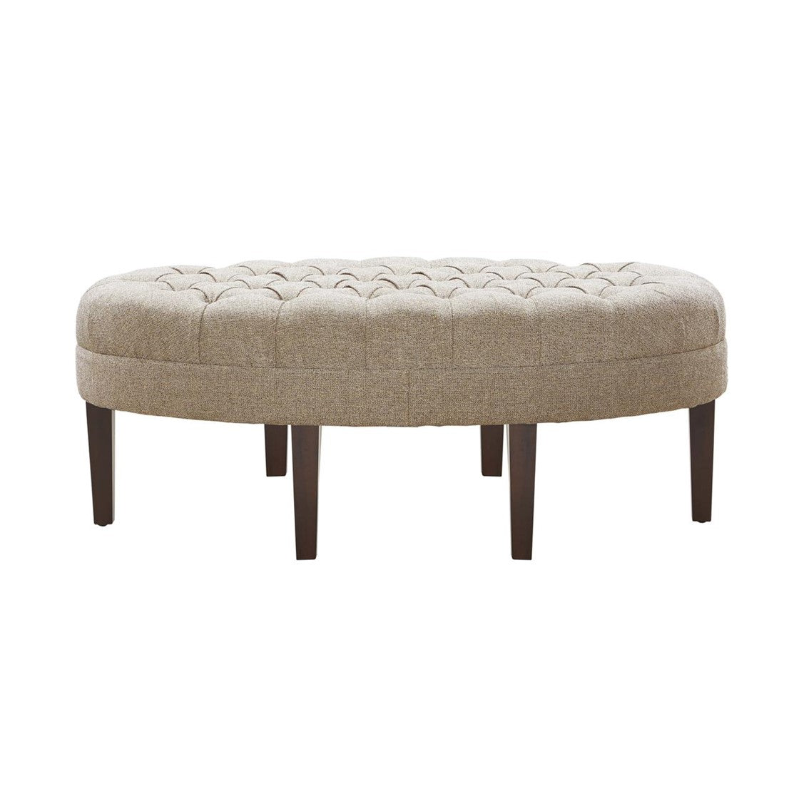 Prop up your feet and relax with the Madison Park Martin Surfboard Tufted Ottoman. This upholstered oval-shaped ottoman features a button tufted top that adds an elegant modern look. Solid wood straight legs with dark finish create a rich and striking contrast. Use this tufted ottoman as the perfect centerpiece in your living room to complete your decor. Only leg assembly is required. Spot clean or professional steam clean.