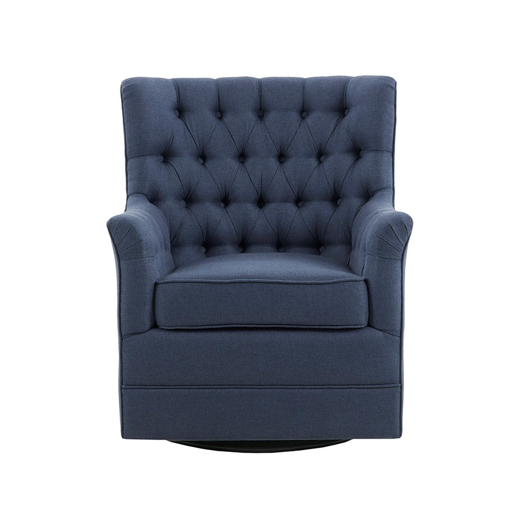 Relax in the comfort and style of the madison park mathis swivel glider chair. This swivel chair is upholstered in a soft fabric with a hand-tufted back to create a traditional look. The swivel glide base allows the chair to rotate 360 degrees, while also being able to rock smoothly back and forth. With a comfy removable seat cushion, this swivel glider chair adds a classic comfortable touch to your living room.