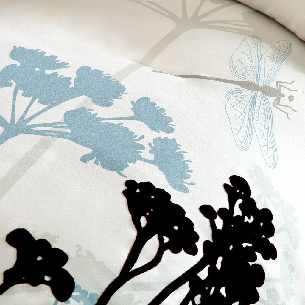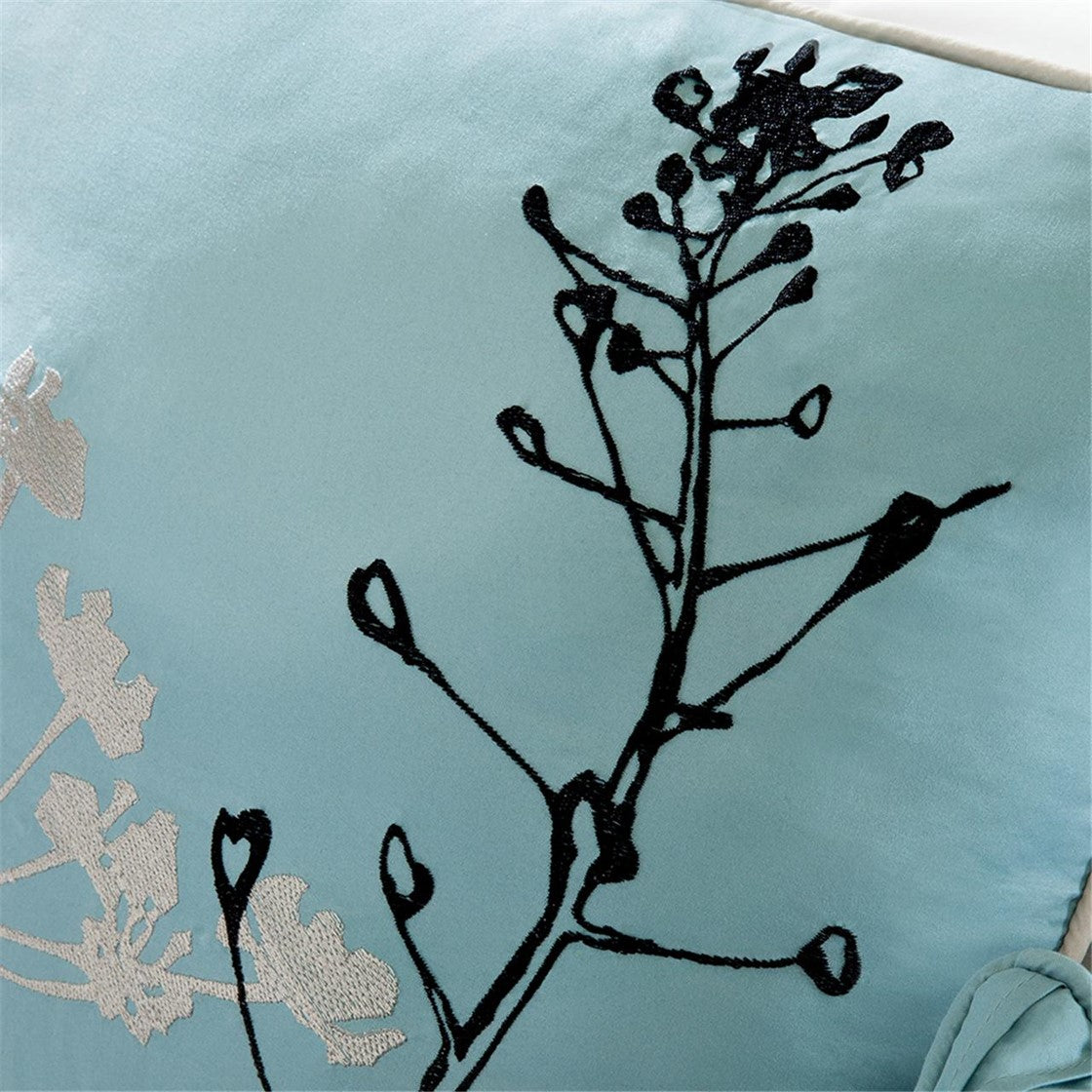 Lighten up your bedroom with the Madison Park Matilda Collection. This beautiful set is made from a printed polyester microfiber with black flocking on the design and a brushed polyester reverse. The addition of flocking to this set gives a three-dimensional look to the top of bed for added value. The pale blue floral design works well against the stark black for the perfect balance. Three decorative pillows provide piecing and embroidery details pulling this entire look together.