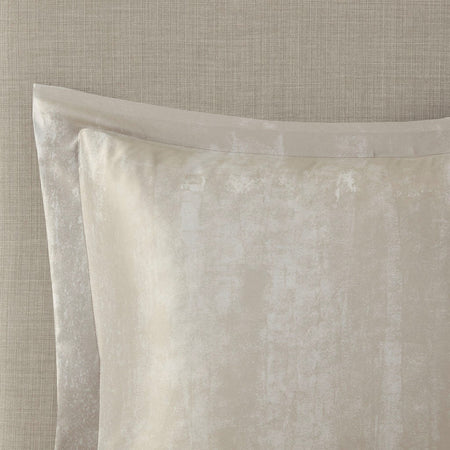 Three decorative pillows with embroidery and pleating details as well as a solid grey bed skirt provide the perfect finishing touches. Machine washable in a large capacity washer and dryer, this metallic print comforter set transforms your bedroom into a modern and glamorous space. Items in the set may come in a rolled or compressed packaging, which will need to be fluffed up or steam ironed before use to remove wrinkles.