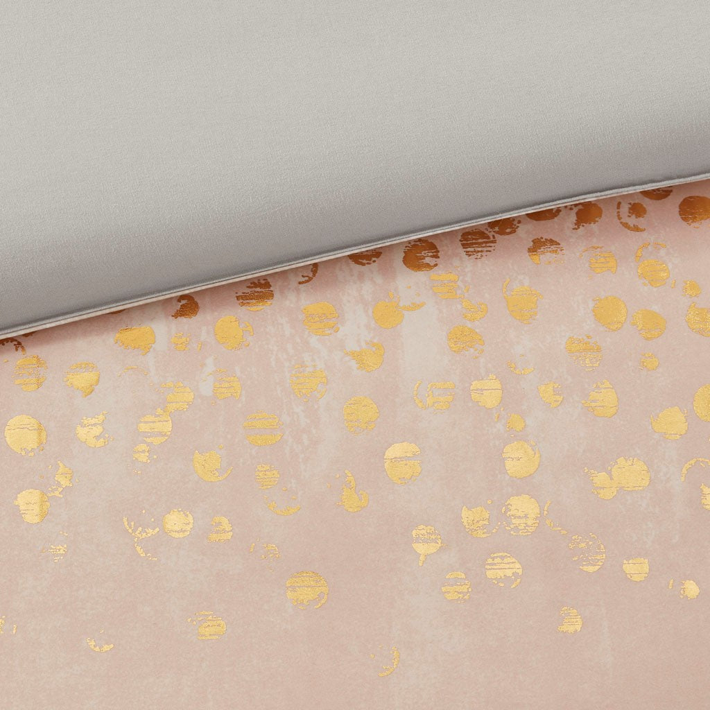 Elevate your bedroom with the glamorous style of the Madison Park Midnight Garden 7 Piece Metallic Print Comforter Set. The comforter features a satin charmeuse fabric top, in blush and grey hues, with a gold metallic foil print in the center, creating a stunning luxurious look. A solid grey microfiber reverse adds a soft touch and two matching shams complete the modern comforter set.