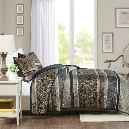 Dress your bed with the eclectic boho style of the Madison Park Miramar 3 Piece Reversible Cotton Coverlet Set. Flaunting a globally inspired medallion print, this cotton coverlet features a chic border design to accent the boho pattern on the face. A solid gray reverse complements the top of the reversible coverlet, while two matching shams complete the trendy transitional bedding set. Machine washable for easy care, this reversible cotton coverlet set has an antimicrobial treatment that provides built-in freshness protection, inhibits growth of odor causing bacteria, and keeps the fabric newer, longer.