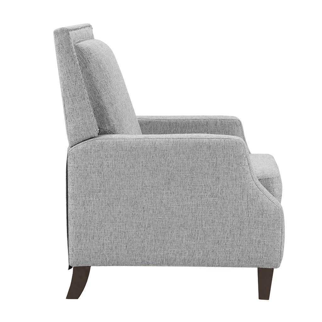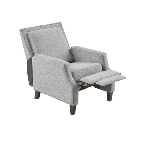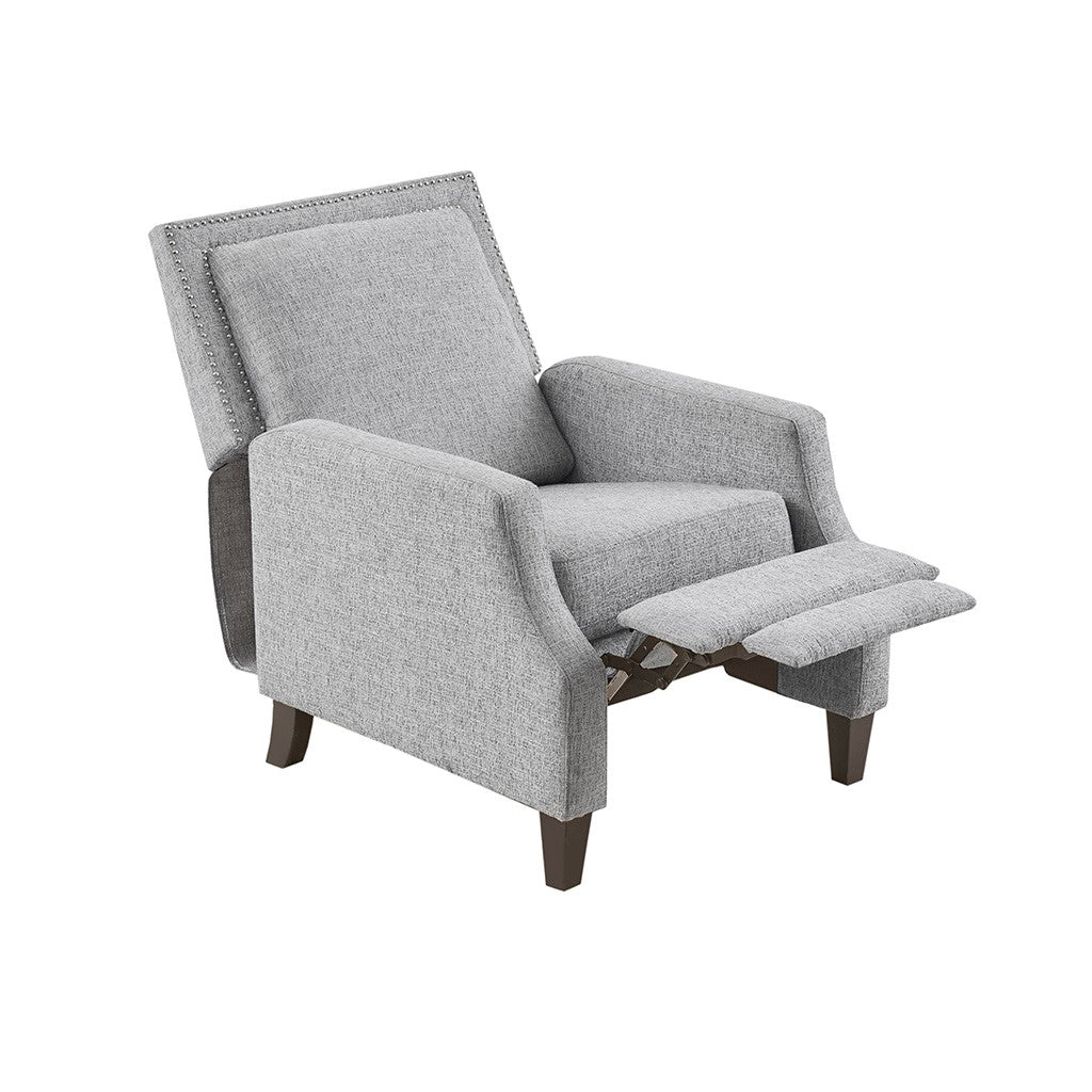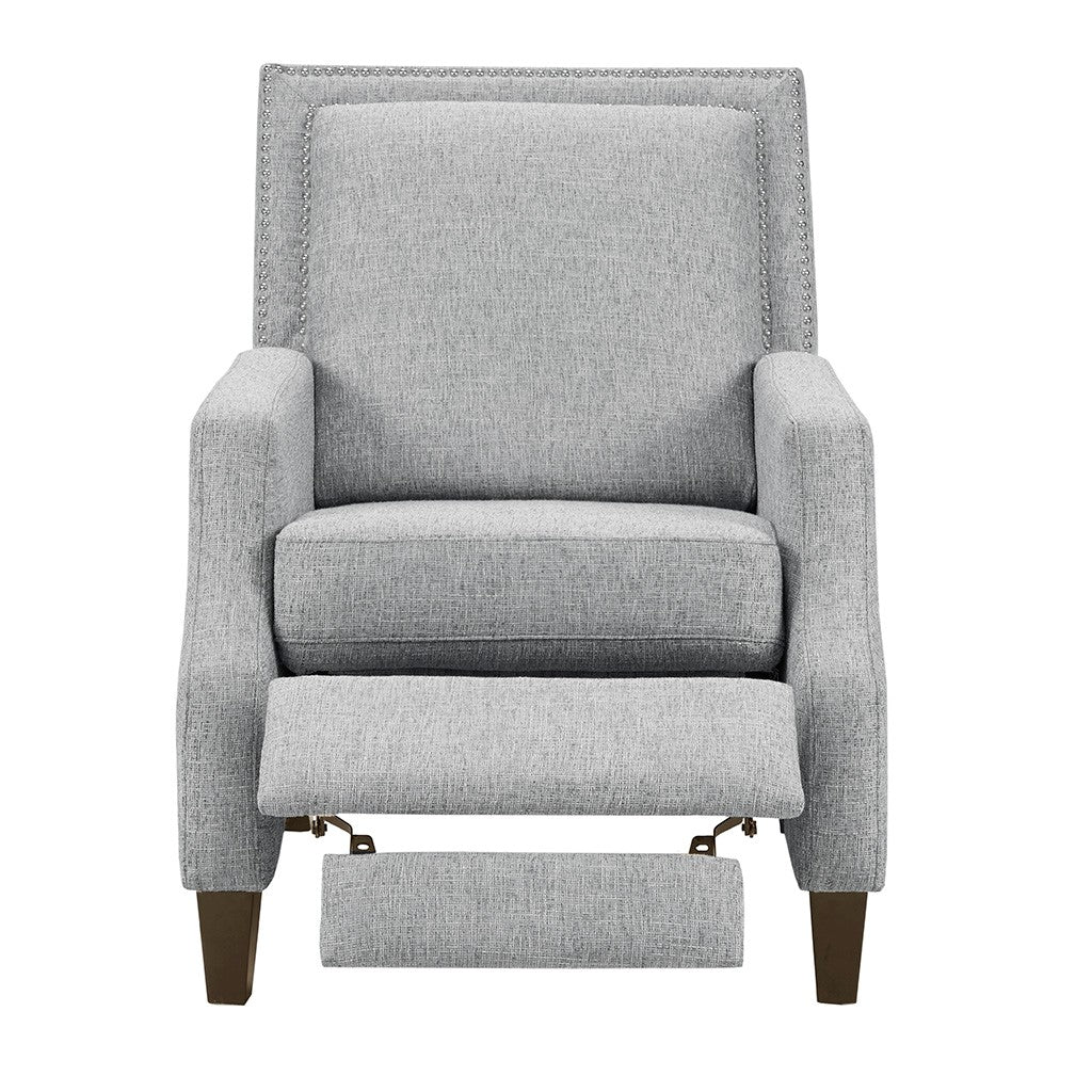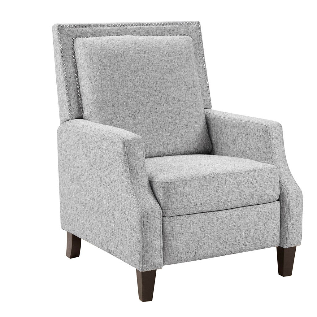Sit back and relax in the comfort of the Madison Park Naomi Push Back Recliner. The solid grey upholstery and black finish on the squared wooden legs create a stunning look while the double row of the silver nail heads provides an elegant trim. A high back and track arms form a simple silhouette, making this recliner the perfect addition to your transitional style living room. This recliner also features a maximum weight capacity of 300 lbs. You can easily recline back in luxurious comfort.Partial assembly required and no tools are needed.
