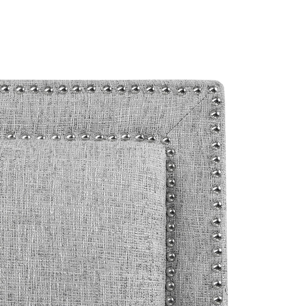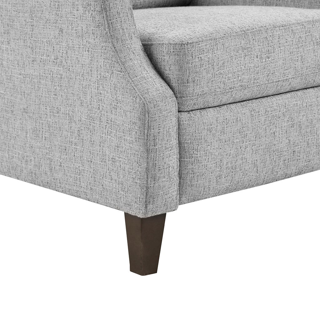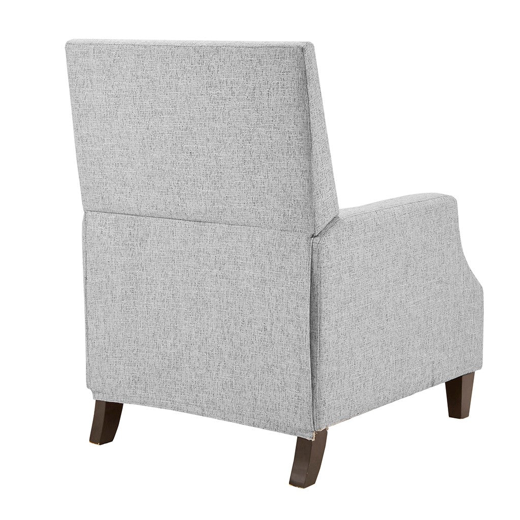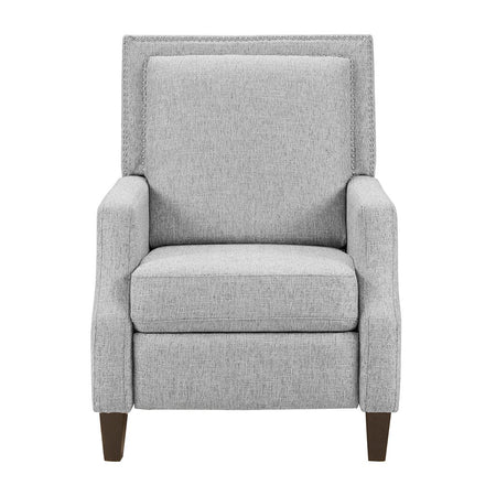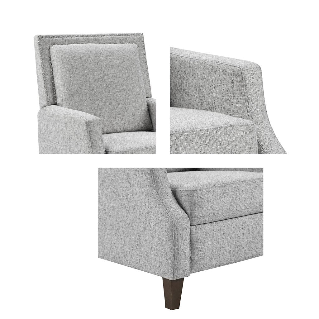 Sit back and relax in the comfort of the Madison Park Naomi Push Back Recliner. The solid grey upholstery and black finish on the squared wooden legs create a stunning look while the double row of the silver nail heads provides an elegant trim. A high back and track arms form a simple silhouette, making this recliner the perfect addition to your transitional style living room. This recliner also features a maximum weight capacity of 300 lbs. You can easily recline back in luxurious comfort.Partial assembly required and no tools are needed.