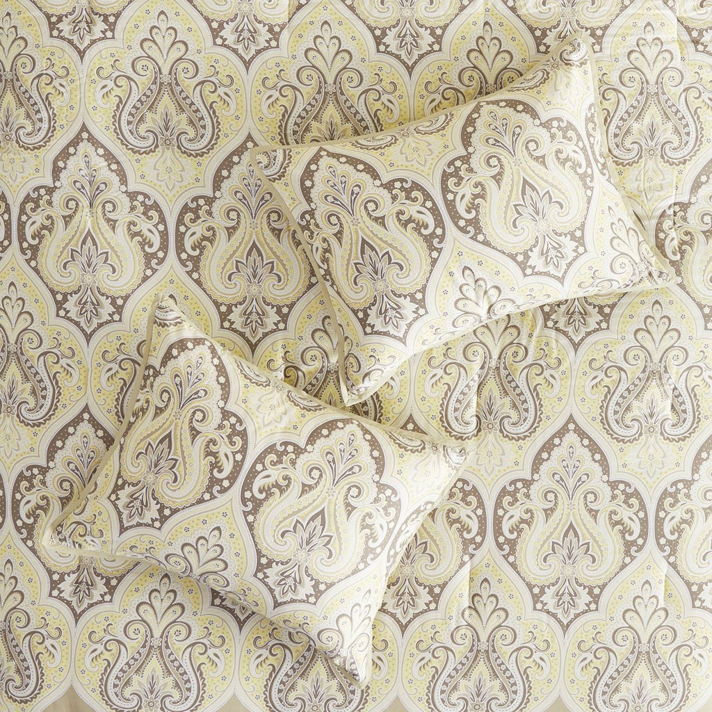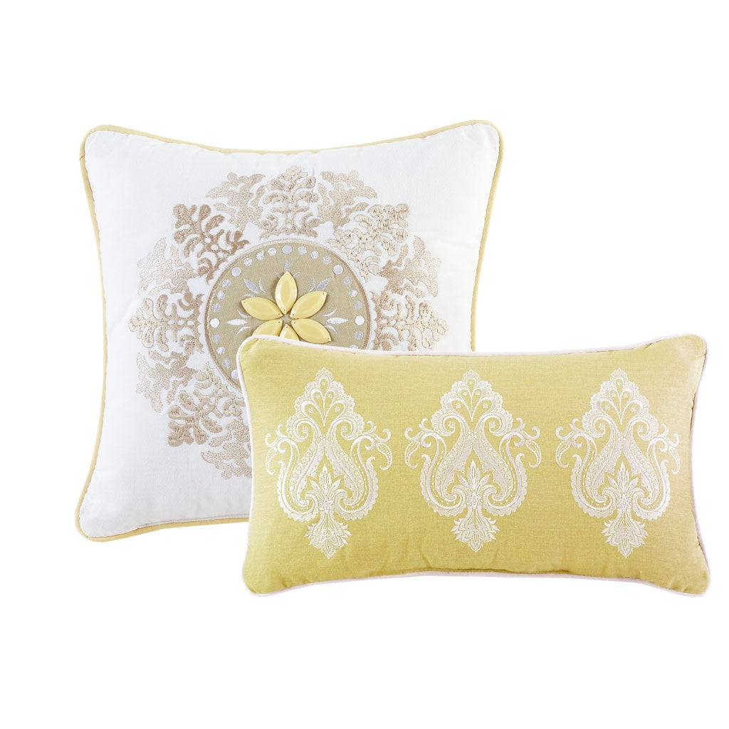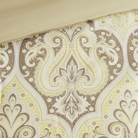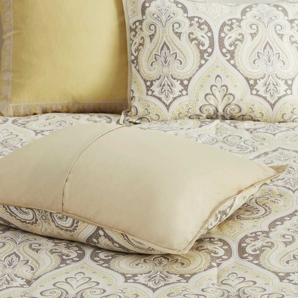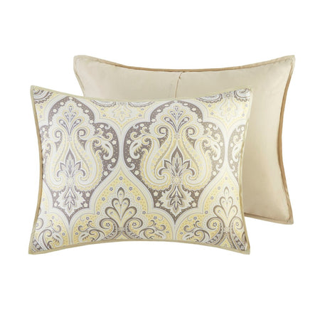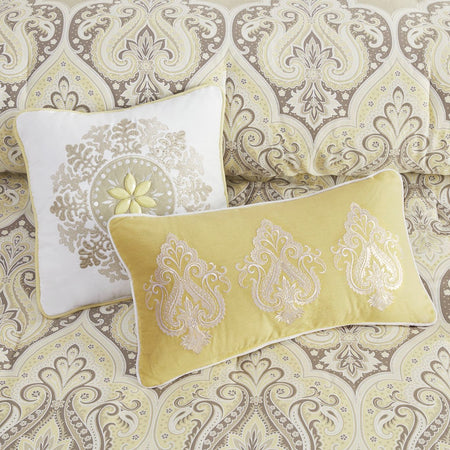 Update your bedroom with the globally inspired style of the Madison Park Nisha Comforter Set. This comforter features an updated paisley pattern inside an ogee design, creating an elegant look. Matching shams (1 for Twin Sizes) and coordinating Euro shams (1 for Twin Sizes) complement the comforter. Two decorative pillows with beading and embroidery add the finishing touches. This bedding set is also OEKO-TEX certified, meaning it does not contain any harmful substances or chemicals to ensure quality comfort and wellness.