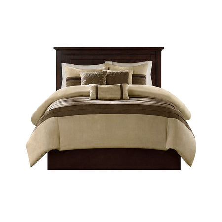 The Madison Park Palmer 7 Piece Comforter Set offers a classic and refined update to your bedroom decor. This transitional style comforter features a pieced microsuede design in rich contrasting taupe and brown colors to create an incredibly soft look and feel. The 2 matching shams also flaunt a pieced construction to coordinate with the faux suede comforter. A solid brown bed skirt and 3 decorative pillows with a mix of embroidered designs add the perfect finishing touches to complete this lush traditionally-inspired comforter. Machine washable for easy care, items in the set may come in a rolled or compressed packaging, which will need to be fluffed up or steam ironed before use to remove wrinkles.