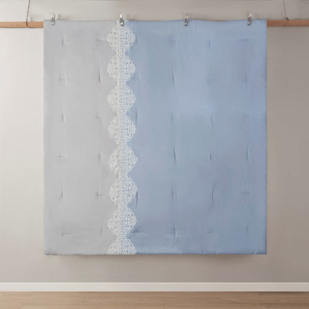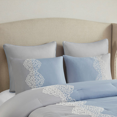 Elegance and glam are brought together in the beautiful transitional design of this luxury comforter set. Soft gray and blue colors are accented by coordinating white floral embroidery to create an understated and charming look. The solid gray reverse complements the top of the bed and gracefully tailored shams match the delicate style of the comforter. Elevate your bedroom with the refreshing style and lush comfort of this embroidered comforter set.