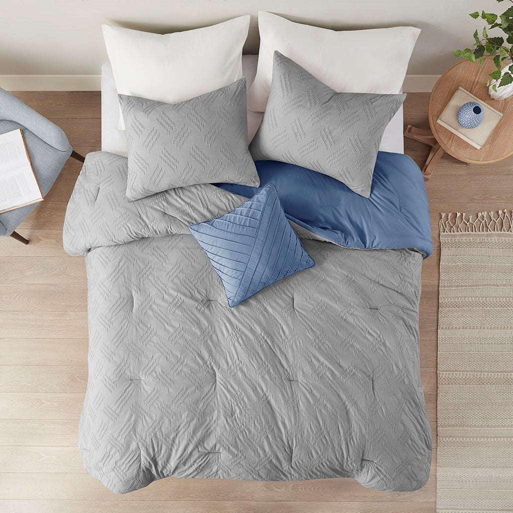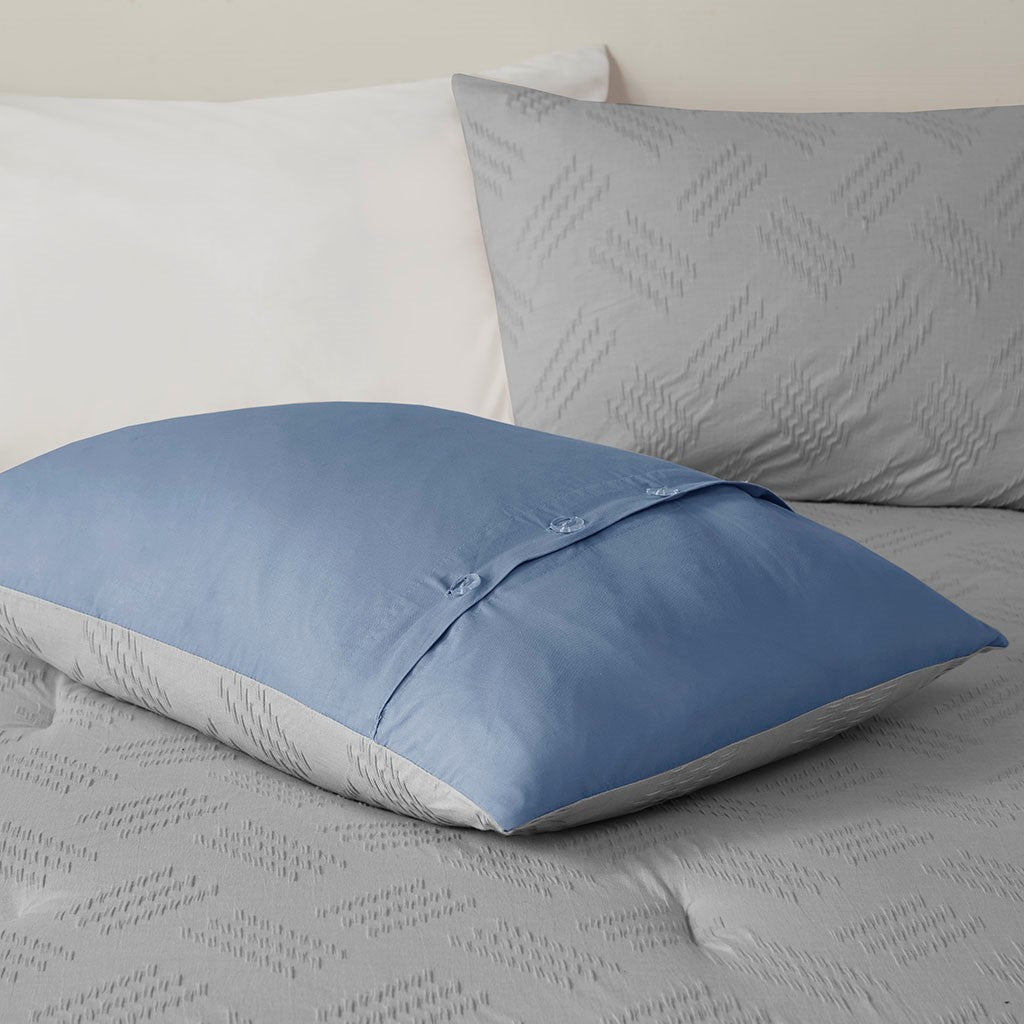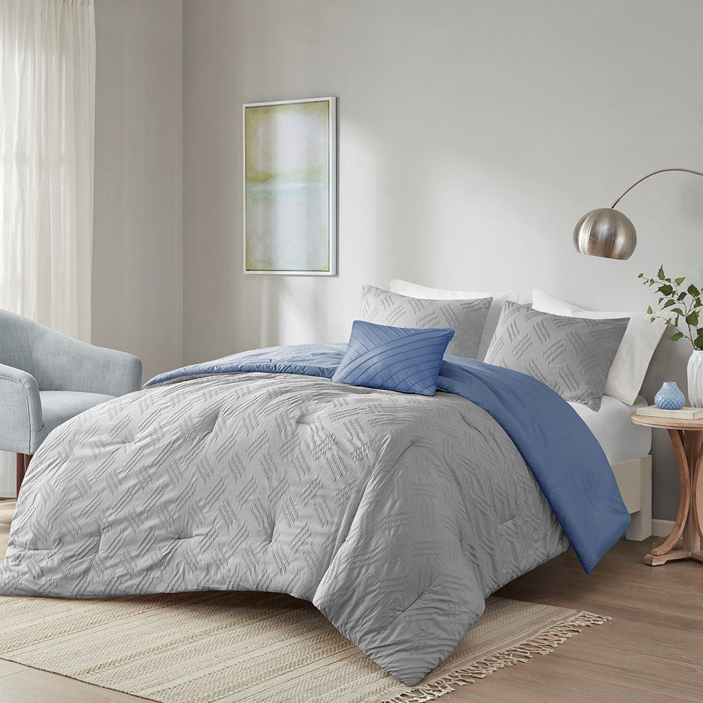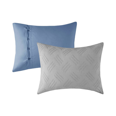 Find refreshing comfort with the unique charm of the Madison Park Perth 4 Piece Organic Cotton Comforter Set. This blue GOTS certified organic cotton comforter features a textured pattern to create a contemporary casual look. The 2 matching shams also showcase yarn dyed stripes to complement the comforter, while a decorative pillow completes this casual bedding set. An antimicrobial treatment prevents bacteria buildup for odor control, keeping the fabric fresher, longer. This modern bedding set is also OEKO-TEX certified, meaning it does not contain any harmful substances or chemicals to ensure quality comfort and wellness.