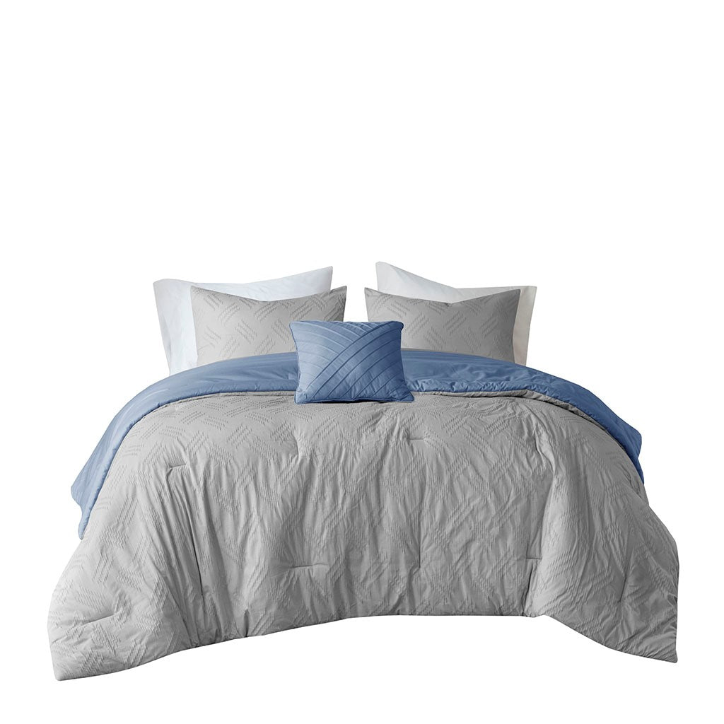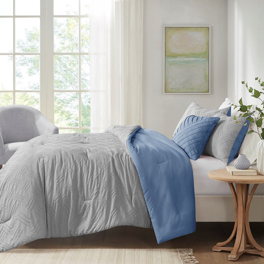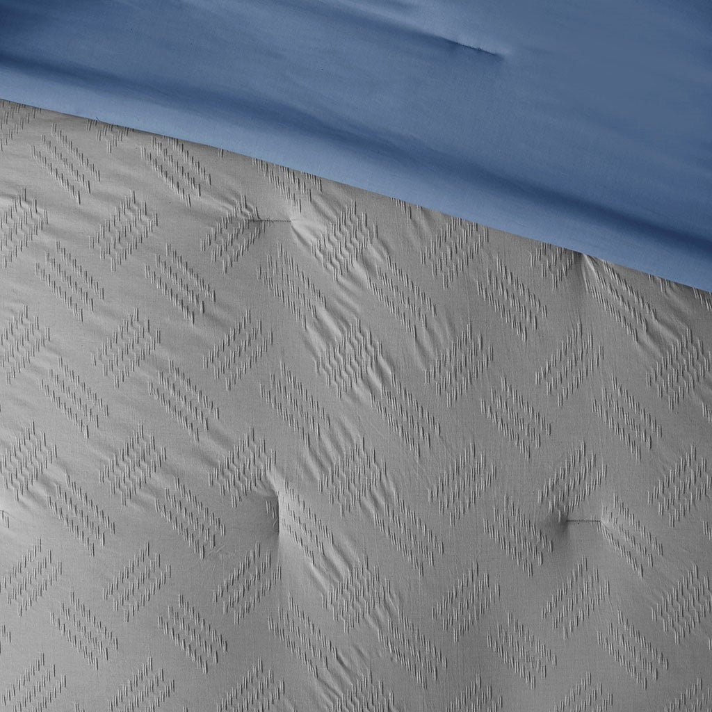 Find refreshing comfort with the unique charm of the Madison Park Perth 4 Piece Organic Cotton Comforter Set. This blue GOTS certified organic cotton comforter features a textured pattern to create a contemporary casual look. The 2 matching shams also showcase yarn dyed stripes to complement the comforter, while a decorative pillow completes this casual bedding set. An antimicrobial treatment prevents bacteria buildup for odor control, keeping the fabric fresher, longer. This modern bedding set is also OEKO-TEX certified, meaning it does not contain any harmful substances or chemicals to ensure quality comfort and wellness.