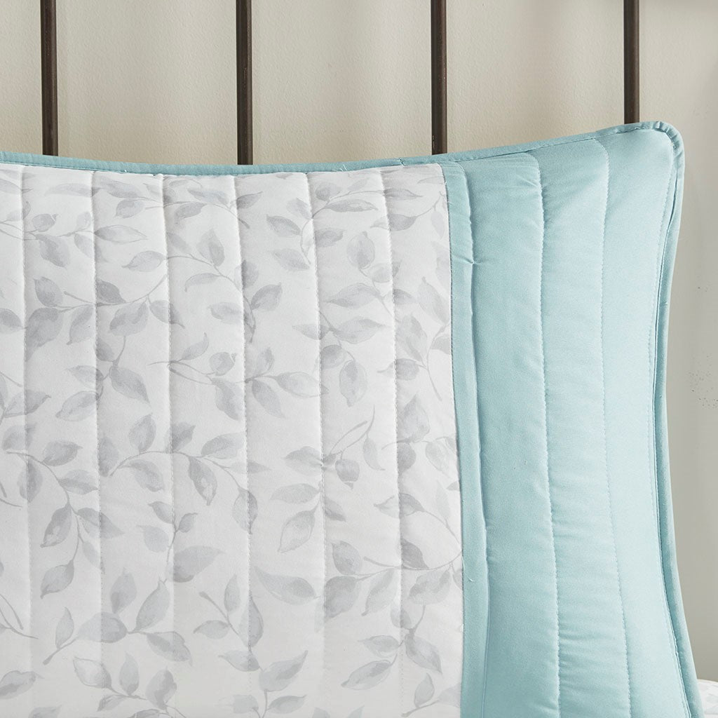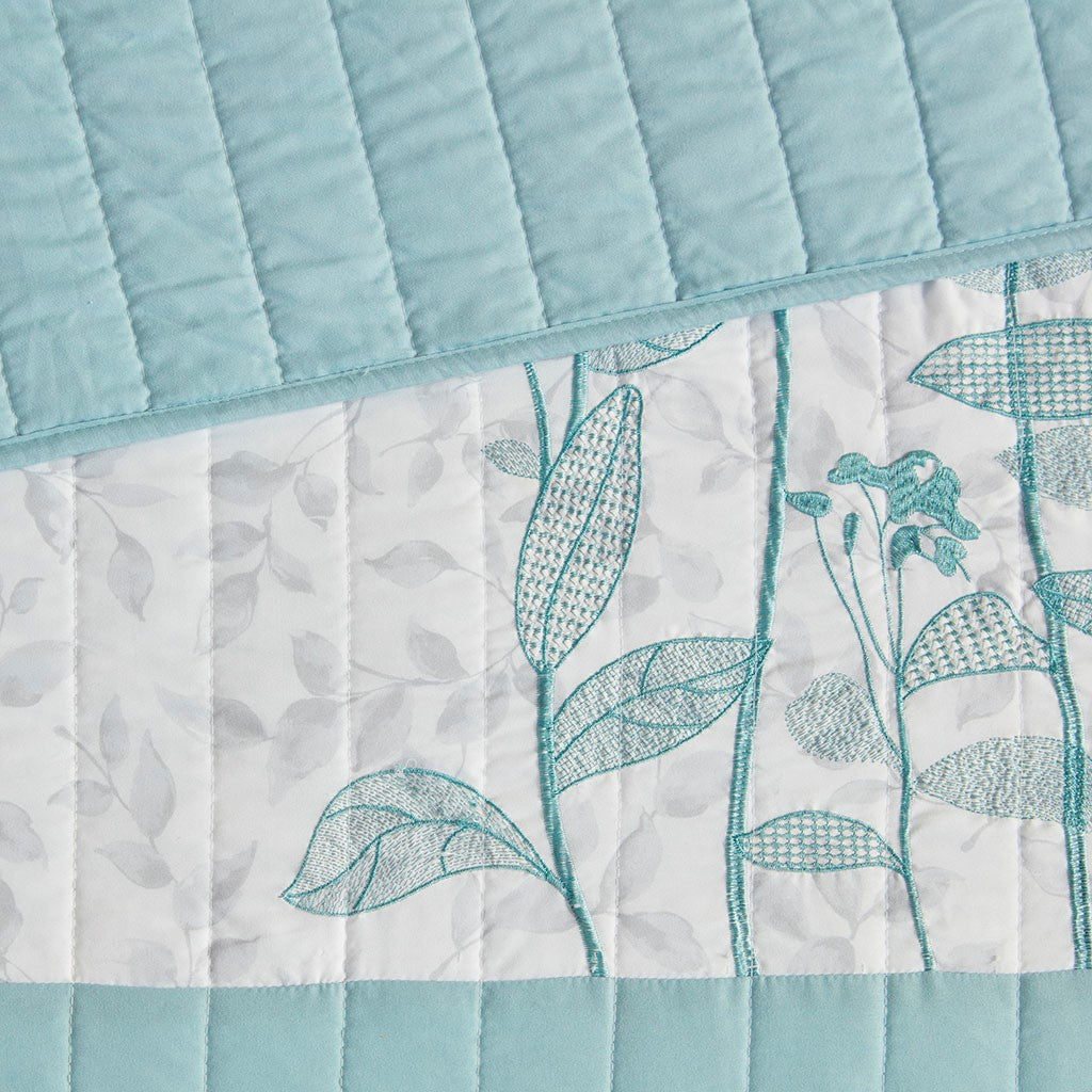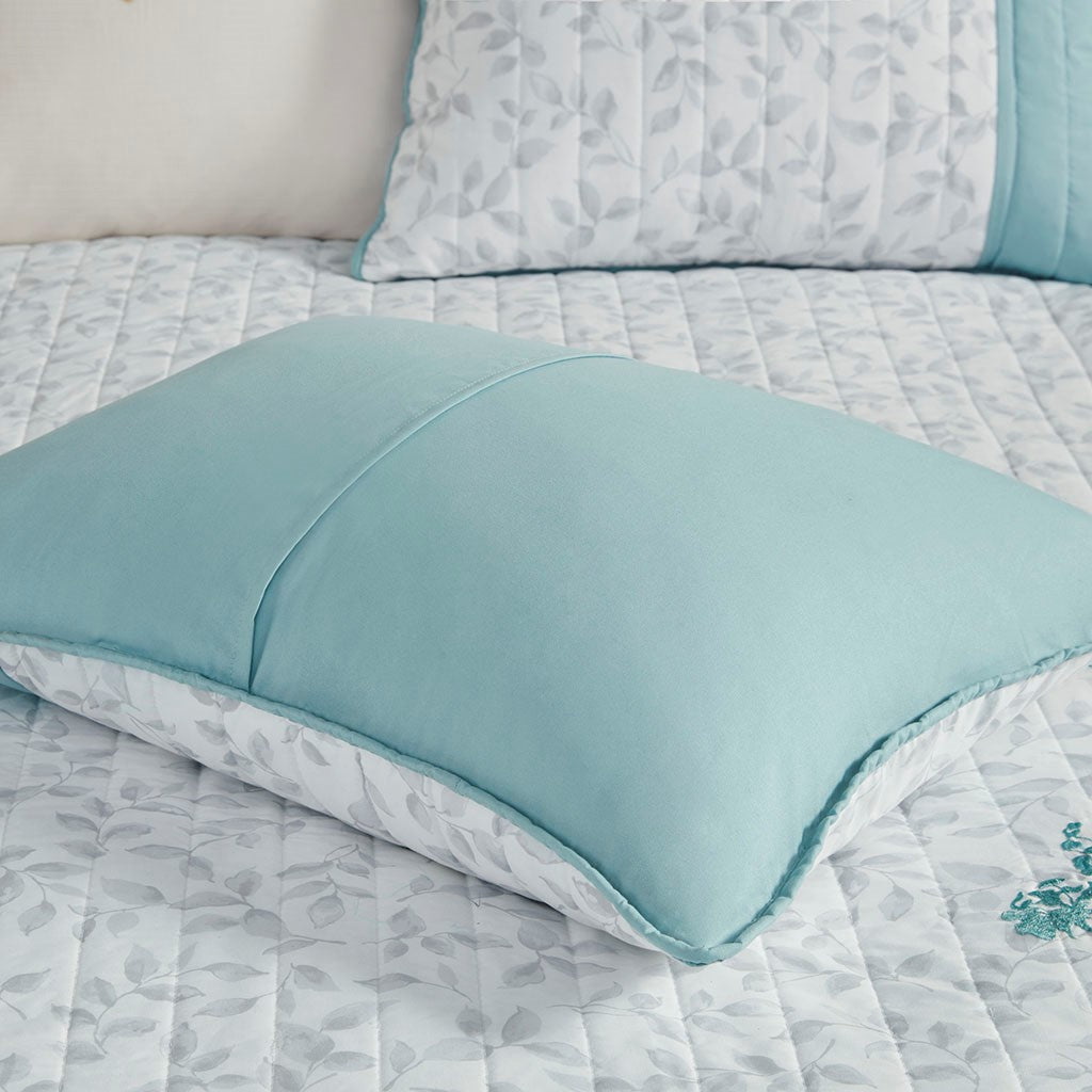 Create a cozy bedroom space with the refreshing charm of Madison Park's Pippa 4 Piece Microfiber Coverlet Set. This soft microfiber coverlet features a gray leaf print with a blue embroidered floral design, for an elevated transitional look. The solid blue reverse brings a splash of color to accent the face of the coverlet. Two matching shams repeat the floral pattern, while a coordinating decorative pillow provides a chic finishing touch. Machine washable, this microfiber coverlet set has an antimicrobial treatment that provides built-in freshness protection, inhibits growth of odor causing bacteria, and keeps the fabric newer, longer.