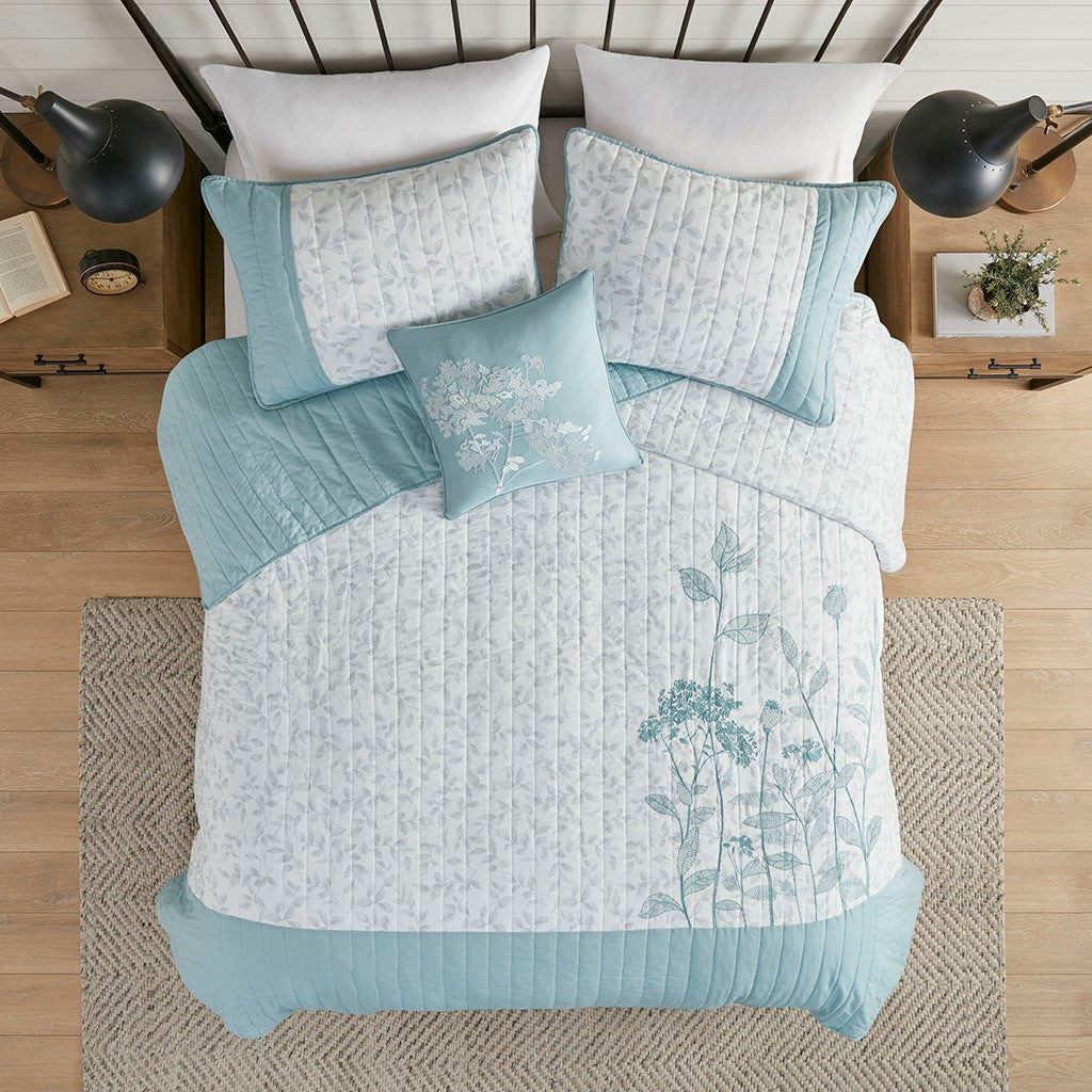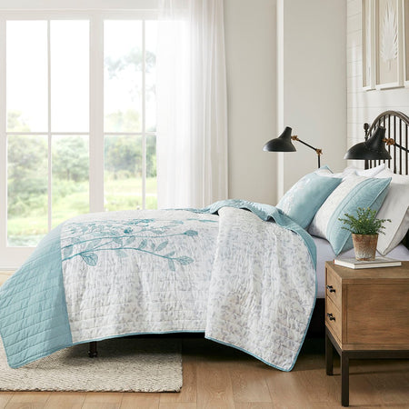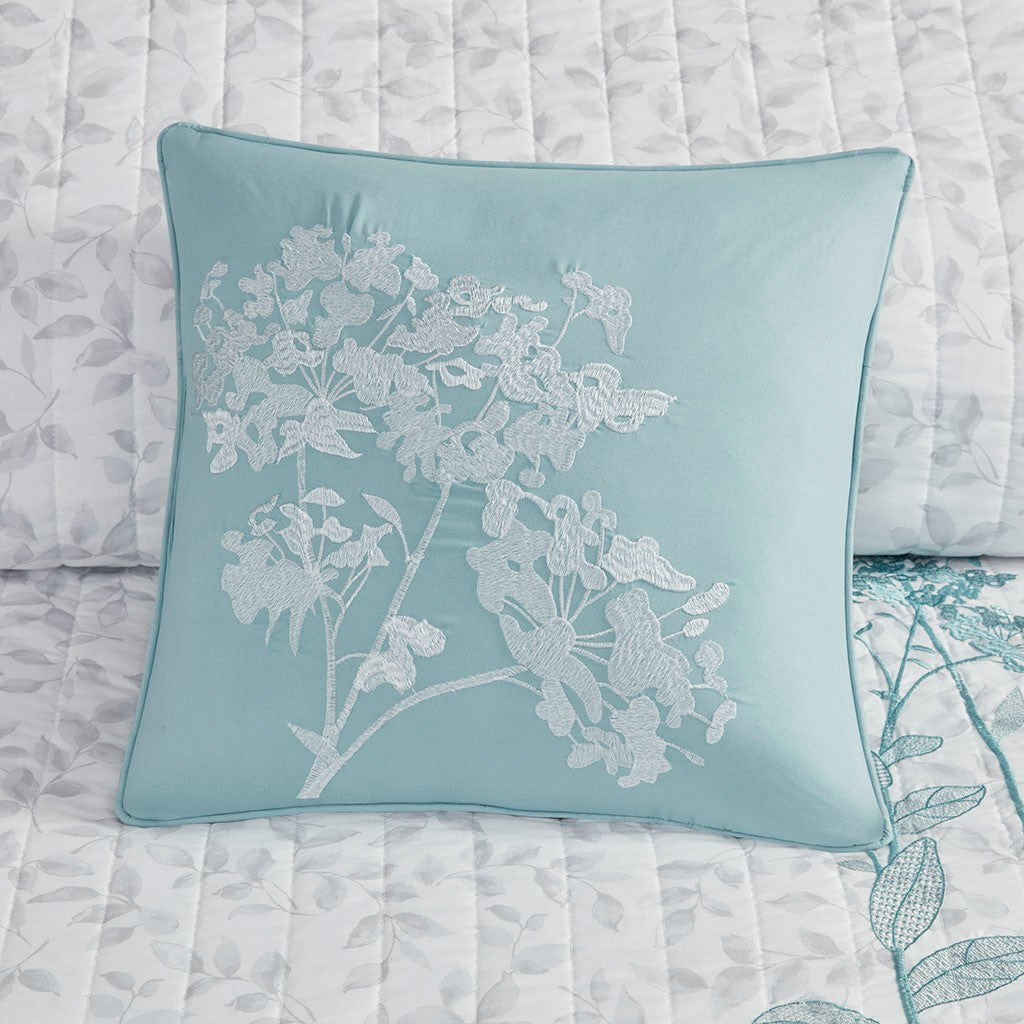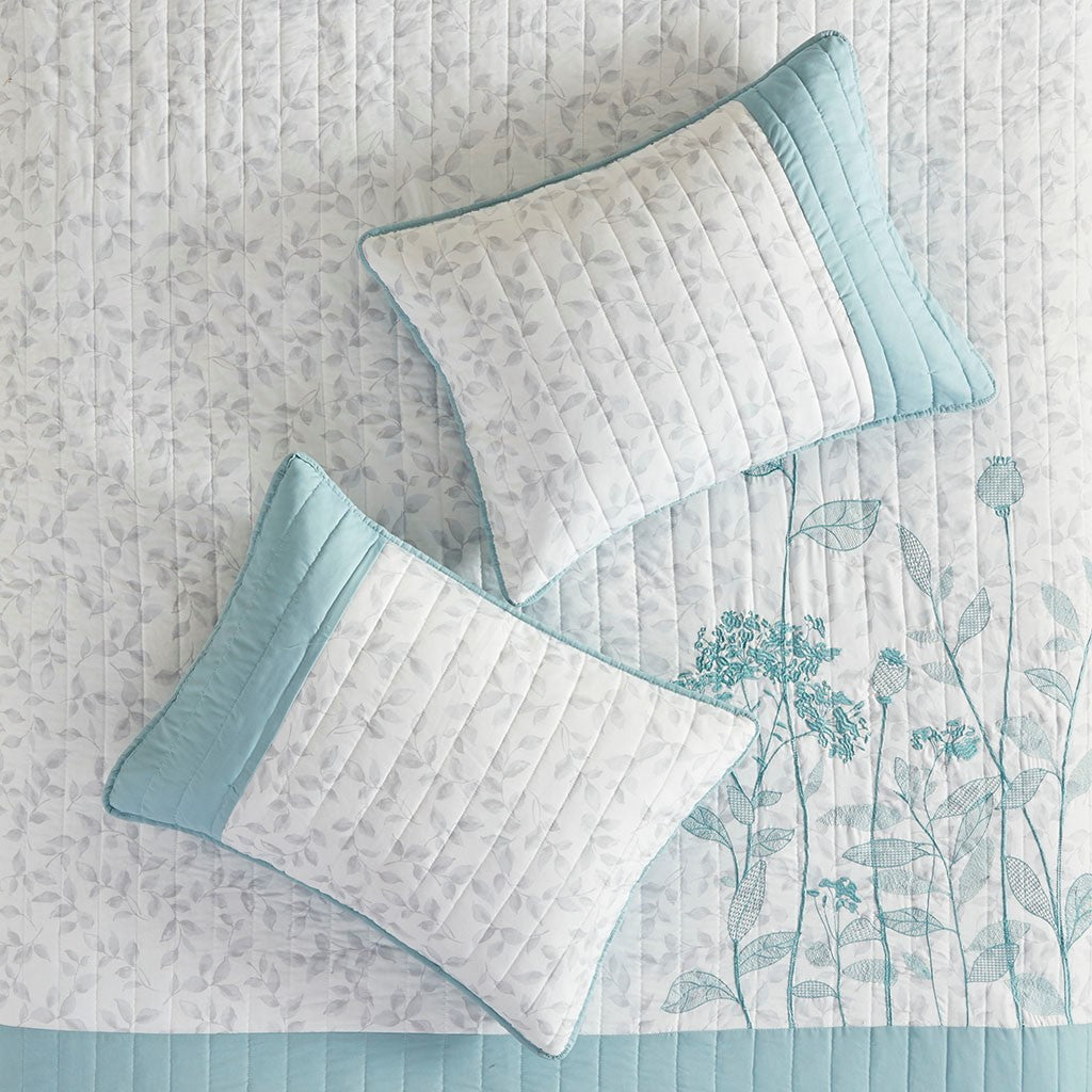 Create a cozy bedroom space with the refreshing charm of Madison Park's Pippa 4 Piece Microfiber Coverlet Set. This soft microfiber coverlet features a gray leaf print with a blue embroidered floral design, for an elevated transitional look. The solid blue reverse brings a splash of color to accent the face of the coverlet. Two matching shams repeat the floral pattern, while a coordinating decorative pillow provides a chic finishing touch. Machine washable, this microfiber coverlet set has an antimicrobial treatment that provides built-in freshness protection, inhibits growth of odor causing bacteria, and keeps the fabric newer, longer.