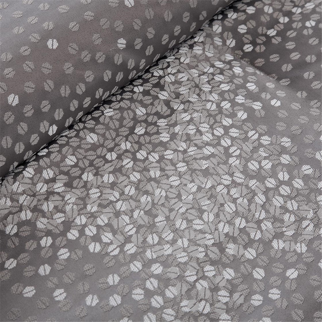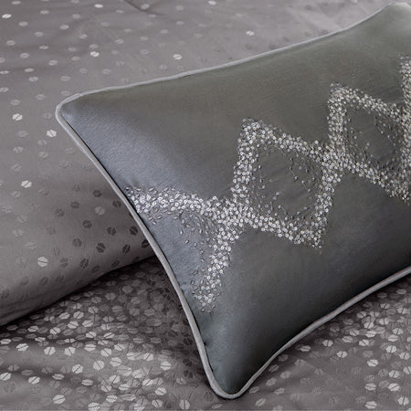 Invigorate your space with the striking modern look of the Madison Park Quinn 7 Piece Jacquard Comforter Set. The grey jacquard woven comforter flaunts a sequin design that adds a stunning contemporary accent to the top of the bed, while a solid grey reverse provides a rich touch of color. Matching shams echo the look of the comforter, spreading the dazzling allure to the head of the bed. Three decorative pillows with embroidered details and a solid grey bed skirt complete the bedding set by providing the perfect finishing touches. Machine washable, this jacquard comforter set brings a bit of glitz and glam to update your bedroom decor. Items in the set may come in a rolled or compressed packaging, which will need to be fluffed up or steam ironed before use to remove wrinkles.