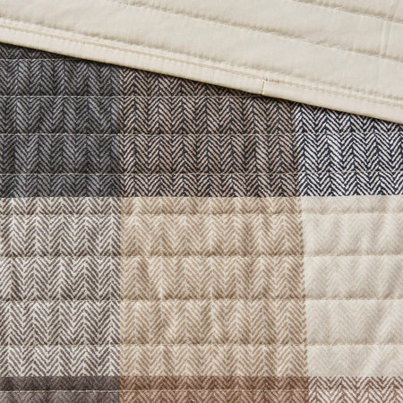 For an irresistibly warm and comfortable look, Madison Park's Ridge 6 Piece Herringbone Coverlet Set is the perfect update to your bed. This reversible coverlet sports a buffalo plaid pattern printed on herringbone fabric, for a cabin-inspired look. The bold design gives way to a printed herringbone border at the foot of the bed, adding a charming touch. Coordinating shams mimic the style of the coverlet, enhancing the warm and cozy lodge aesthetic. Three decorative pillows with hand-stitched embroidered details bring texture and dimension to the top of the bed. Items in the set may come in a rolled or compressed packaging, which will need to be fluffed up or steam ironed before use to remove wrinkles.