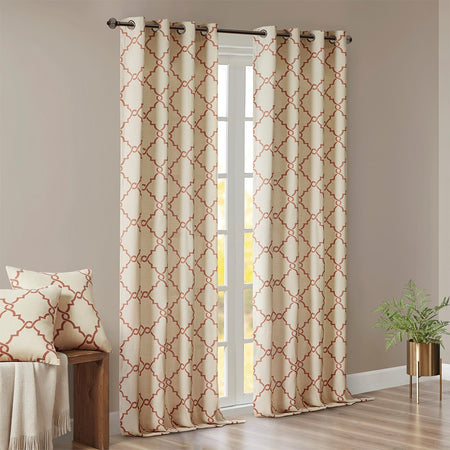The Madison Park Saratoga Fret Print Panel is the perfect addition for a casual and stylish update to your home decor. This window panel features a trendy spice fretwork on a soft beige ground, creating a simple yet modern look. The cotton blend basket weave fabric softly filters the perfect amount of sunlight into your home, while providing texture for natural appeal. Silver grommet top detail makes this panel easy to hang, open, and close throughout the day. Fits up to a 1.25" diameter rod. Pattern position may vary per panel due to random cutting of fabric.