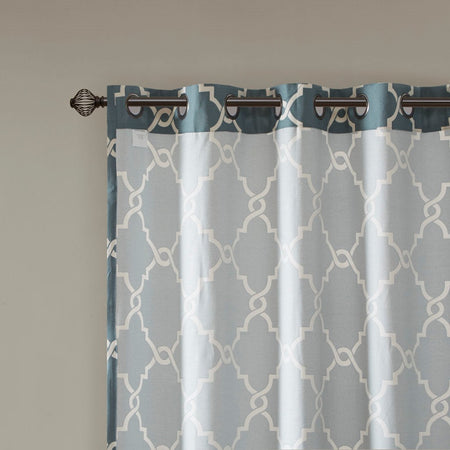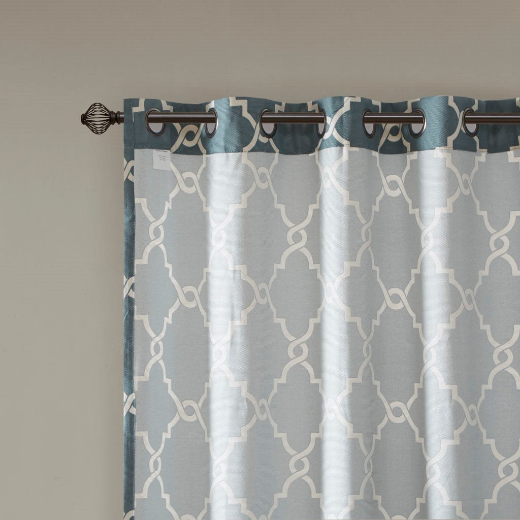 The Madison Park Saratoga Fret Print Panel is the perfect addition for a casual and stylish update to your home decor. This window panel features a trendy light beige fretwork on a soft blue ground, creating a simple yet modern look. The cotton blend basket weave fabric softly filters the perfect amount of sunlight into your home, while providing texture for natural appeal. Silver grommet top detail makes this panel easy to hang, open, and close throughout the day. Fits up to a 1.25" diameter rod. Pattern position may vary per panel due to random cutting of fabric.