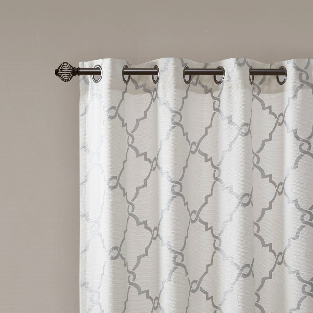 The Madison Park Saratoga Fret Print Panel is the perfect addition for a casual and stylish update to your home decor. This window panel features a trendy metallic silver fretwork on a soft ivory ground, creating a simple yet modern look. The cotton blend basket weave fabric softly filters the perfect amount of sunlight into your home, while providing texture for natural appeal. Silver grommet top detail makes this panel easy to hang, open, and close throughout the day. Fits up to a 1.25" diameter rod. Pattern position may vary per panel due to random cutting of fabric.