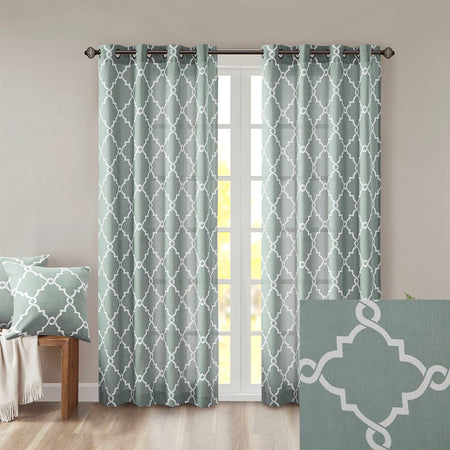 The Madison Park Saratoga Fret Print Panel is the perfect addition for a casual and stylish update to your home decor. This window panel features a trendy light beige fretwork on a seafoam ground, creating a simple yet modern look. The cotton blend basket weave fabric softly filters the perfect amount of sunlight into your home, while providing texture for natural appeal. Silver grommet top detail makes this panel easy to hang, open, and close throughout the day. Fits up to a 1.25" diameter rod. Pattern position may vary per panel due to random cutting of fabric.