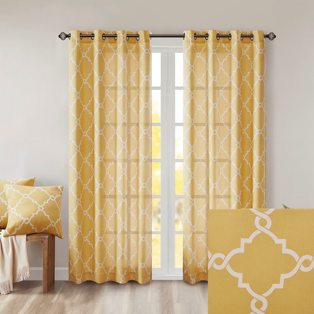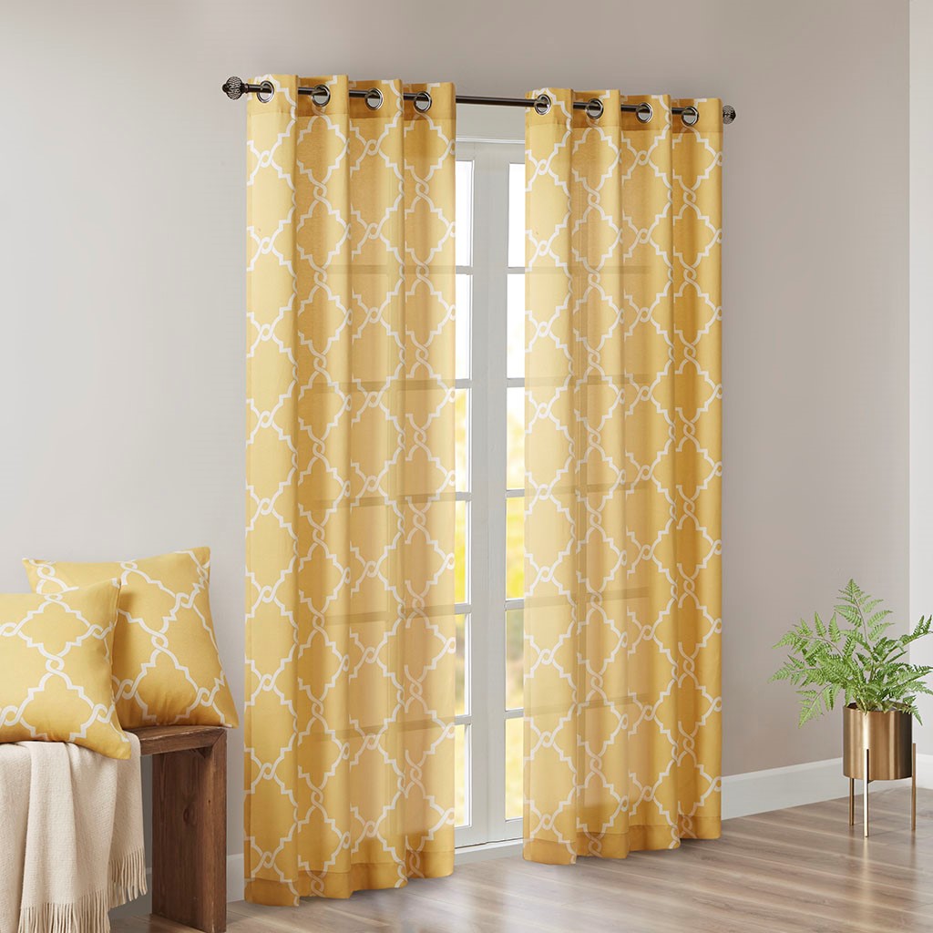 The Madison Park Saratoga Fret Print Panel is the perfect addition for a casual and stylish update to your home decor. This window panel features a trendy light beige fretwork on a soft yellow ground, creating a simple yet modern look. The cotton blend basket weave fabric softly filters the perfect amount of sunlight into your home, while providing texture for natural appeal. Silver grommet top detail makes this panel easy to hang, open, and close throughout the day. Fits up to a 1.25" diameter rod. Pattern position may vary per panel due to random cutting of fabric.