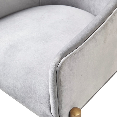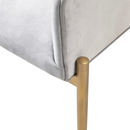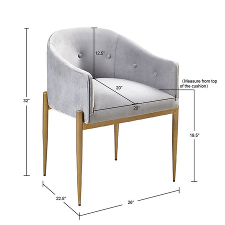 Bring glamorous style to your dining room with the Madison Park Sheraton Dining Chair Set of 2. Each dining chair is upholstered in a soft grey fabric with tufted buttons around the arms and low back to create a luxurious modern look. The metal legs flaunt a distressed gold finish to complement the upholstery and give the chair an upscale, yet understated allure. With their rounded arms and back, each dining chair showcases an elegant silhouette to elevate your dining decor. Assembly is required.