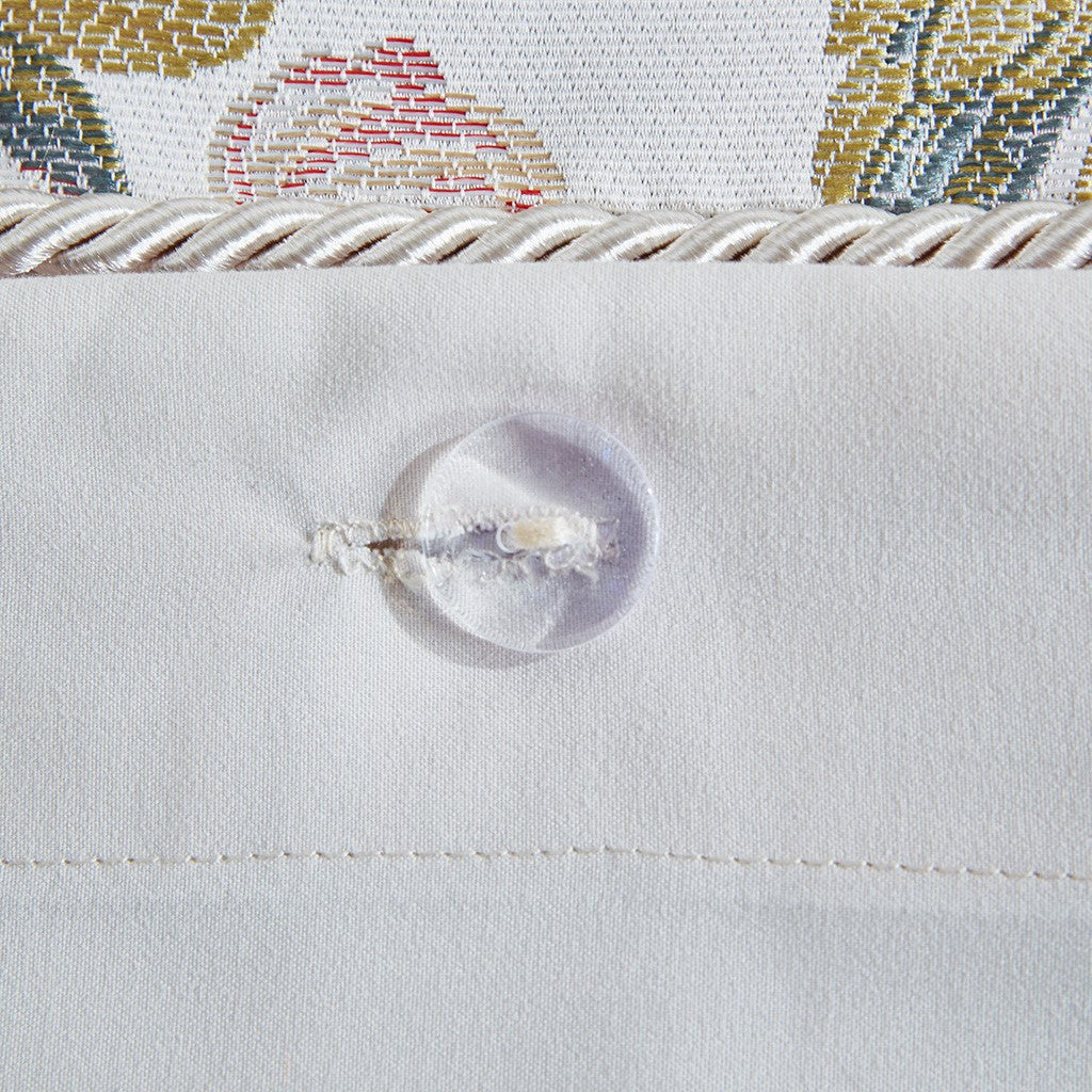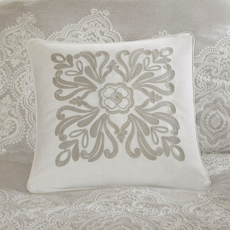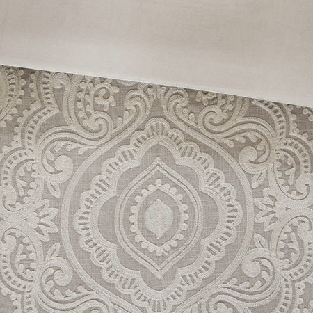 Madison Park Signature's Barely There 9 Piece Comforter Set provides a chic and charming update for the bedroom. Oversized and overfilled for maximum warmth and comfort, the textured comforter features a beautiful white chain stitch embroidery in an intricate damask pattern and natural palette of grey and beige. The solid natural reverse pairs well with the top of bed design, while shams in coordinating colors and simple trim complement the overall look. Three white Euro shams feature embroidered borders in a natural hue that add an elegant and sophisticated touch. A trio of decorative pillows, each with a distinct embroidered pattern or textural detail, round out the gorgeous bedding set. This comforter uses a removable duvet-style insert that is secured by inner ties and a hidden button closure. This provides no visible bartacking lines on top of the bed to create a smooth, clean face. Dry clean comforter cover only and machine wash comforter filler.