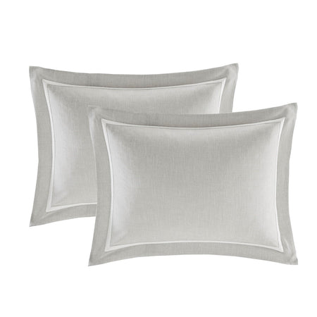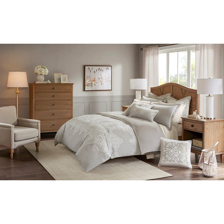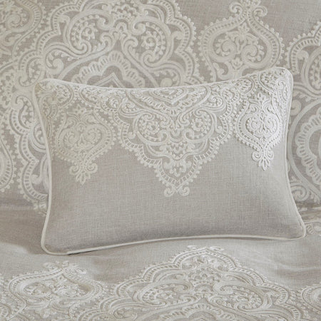 Madison Park Signature's Barely There 8 Piece Comforter Set provides a chic and charming update for the bedroom. Oversized and overfilled for maximum warmth and comfort, the textured comforter features a beautiful white chain stitch embroidery in an intricate damask pattern and natural palette of grey and beige. The solid natural reverse pairs well with the top of bed design, while shams in coordinating colors and simple trim complement the overall look. Two white Euro shams feature embroidered borders in a natural hue that add an elegant and sophisticated touch. A trio of decorative pillows, each with a distinct embroidered pattern or textural detail, round out the gorgeous bedding set. This comforter uses a removable duvet-style insert that is secured by inner ties and a hidden button closure. This provides no visible bartacking lines on top of the bed to create a smooth, clean face. Dry clean comforter cover only and machine wash comforter filler.