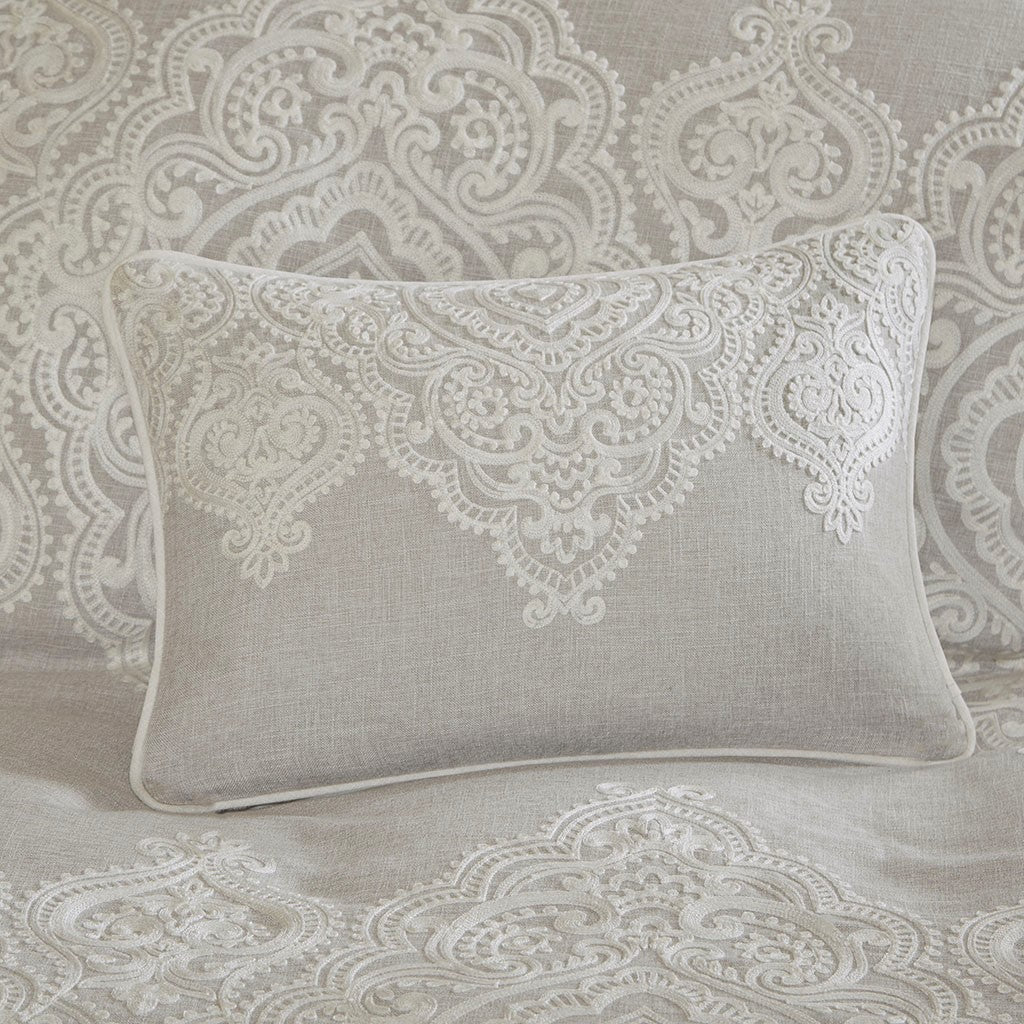 - Features beautiful white chain stitch embroidery in an intricate damask pattern and natural palette of grey and beige