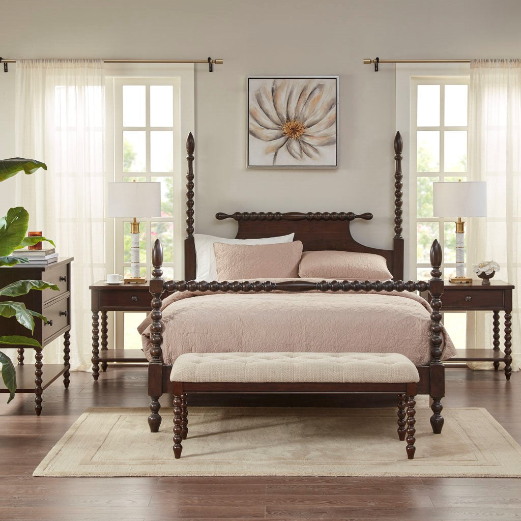 Elevate your bedroom or living room with the Madison Park Signature Beckett Accent Bench. This accent bench features a grey upholstered seat with tufting details that creates a soft textural look. The dark morocco finish perfectly contrasts with the upholstery for a charming farmhouse look and the turned solid wood legs add an elegant touch to the design. Leg assembly required.
