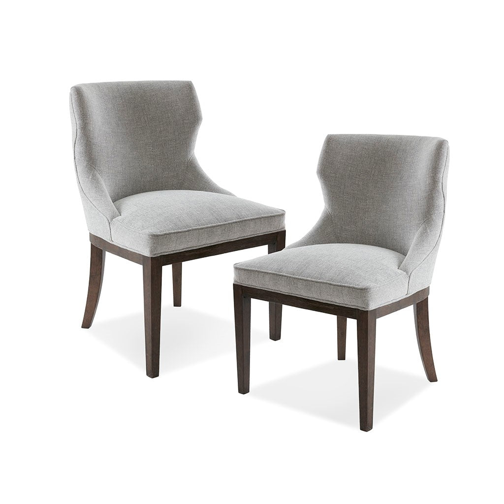 Complete your dining room decor with the Madison Park Signature Hutton Dining Side Chair Set. These traditional dining chairs sport and tight back and seat creating an elegant look. The grey upholstery beautifully contrasts with the burnt walnut finish on the wooden legs. With a stunning design that appeals to most decors, these dining side chairs come in a set of two and provide a chic update to your dining area. Assembly required.