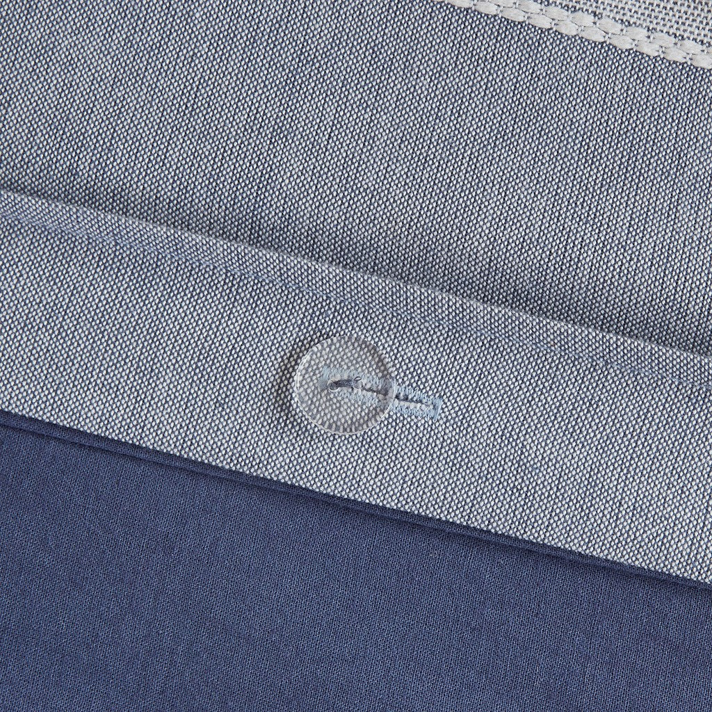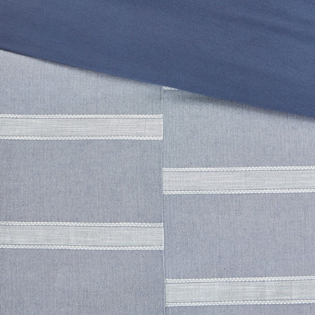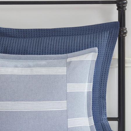 The Madison Park Signature Noble 8 Piece Cotton Comforter Set perfectly blends causal and elegant style to elevate your bedroom. This cotton comforter showcases a woven blue and white stripe pieced design to create an elegant farmhouse look. The cotton weave provides a subtle, soft texture to the oversized comforter, while the overfilled removable insert eliminates visible bartaking lines from the top of the bed, for a clean duvet-style aesthetic. Secured by inner ties and a button closure, the removable insert makes the comforter easy to clean. Also included are 2 striped shams and 2 Euro shams (3 in King) that pair handsomely with the farmhouse comforter. For the finishing touches, 2 square decorative pillows and 1 oblong decorative pillow with waffle matelassé and embroidered detailing complete this luxurious farmhouse comforter set.