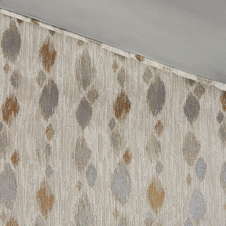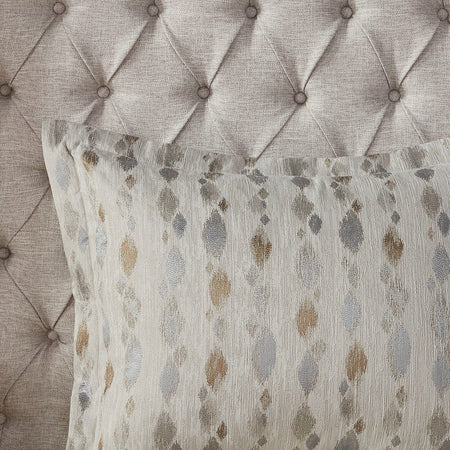 The Madison Park Signature Sanctuary Queen 8 Piece Comforter set offers a luxurious update to your bedroom decor. The oversized and overfilled jacquard comforter features all-over symmetric diamond shapes, in ivory, taupe, gold and silver, with slubbed yarns that create a rich texture and modern look. A heavyweight comforter insert is secured inside the comforter with 4 inner ties and a button closure and is removable for easy care.