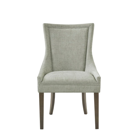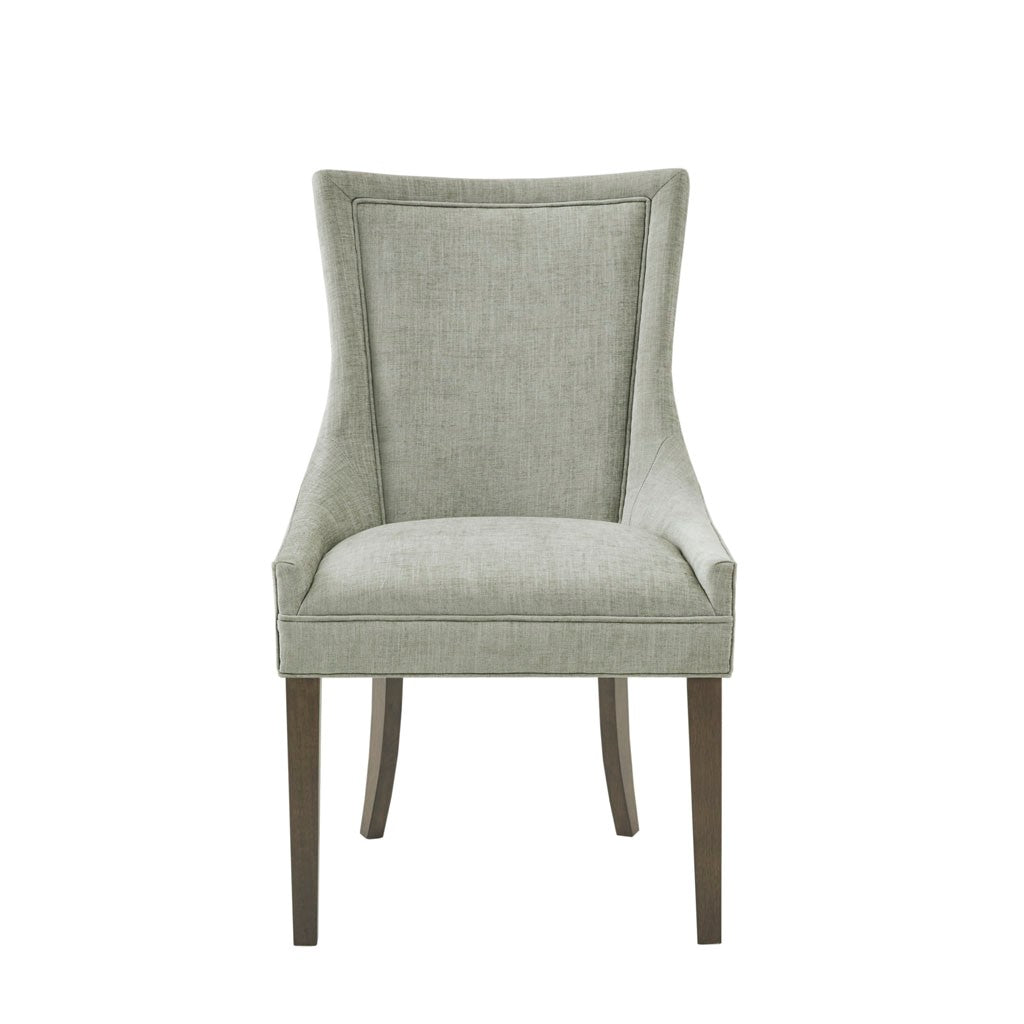 The Madison Park Signature Ultra Dining Chair Set of 2 offers a simple yet elegant update to your dining room decor. Each dining chair features a high back and is upholstered in a multi-hued light green fabric, for an elegant look. The grey finish on the solid wood legs creates a striking contrast with the upholstery. With its sophisticated design, this 2 piece dining chair set adds a traditional touch to your dining room decor. Leg assembly required, tools included.