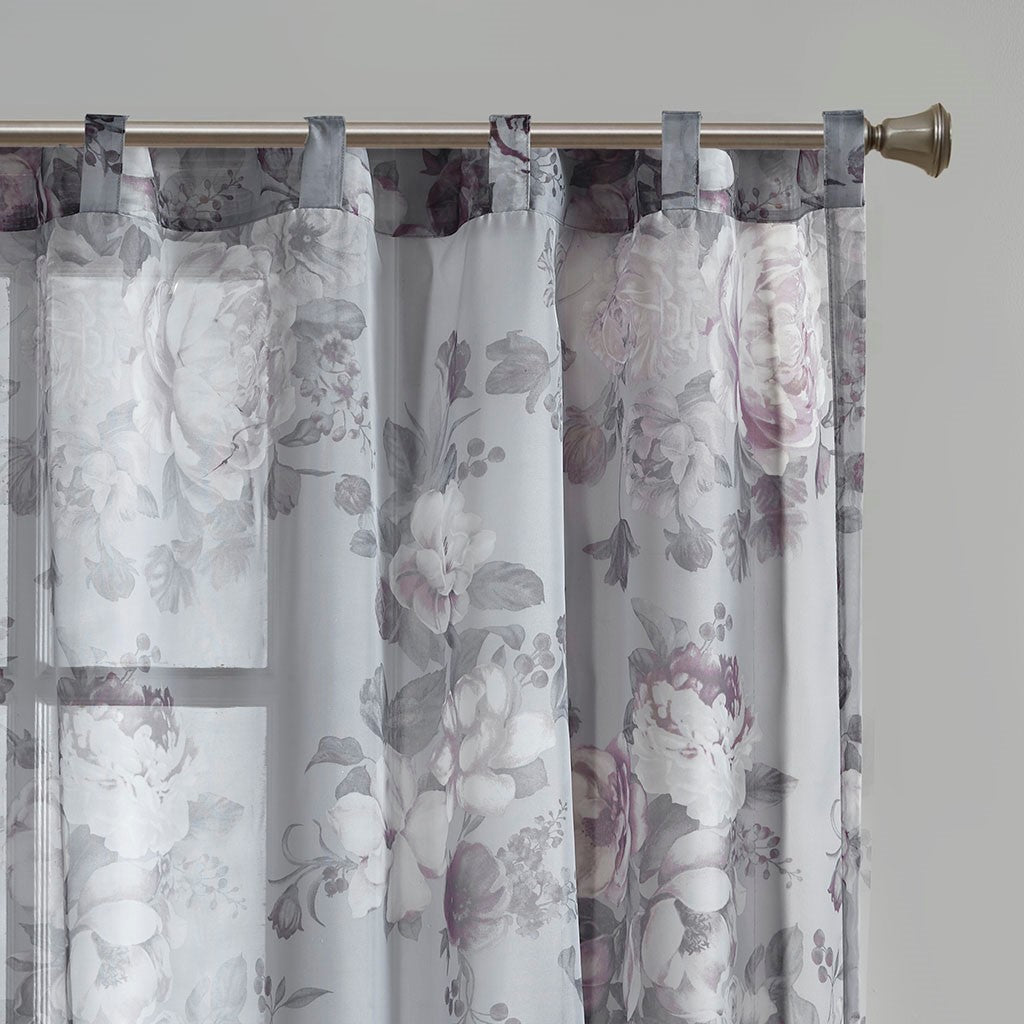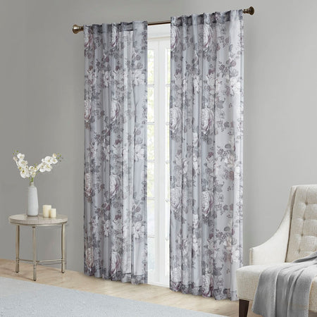 The Madison Park Simone Printed Floral Rod Pocket and Back Tab Top Voile Sheer brings a soft and romantic touch to your home decor. This voile sheer curtain panel features a beautiful mauve and neutral printed floral on a dark grey ground for a rich and stylish contrast, while the lightweight fabric adds a delicate and airy touch. Simply hang on rod pocket top or back tabs for a more tailored look; Fits up to a 1.25" diameter standard size rod. This voile sheer is also OEKO-TEX certified, meaning it does not contain any harmful substances or chemicals, ensuring quality comfort and wellness. Each panel is sold separately and machine washable for easy care. These curtains are perfect on its own as a decorative sheer or even better when layered with either coordinating scarf or any solid panels for a more intricate update!