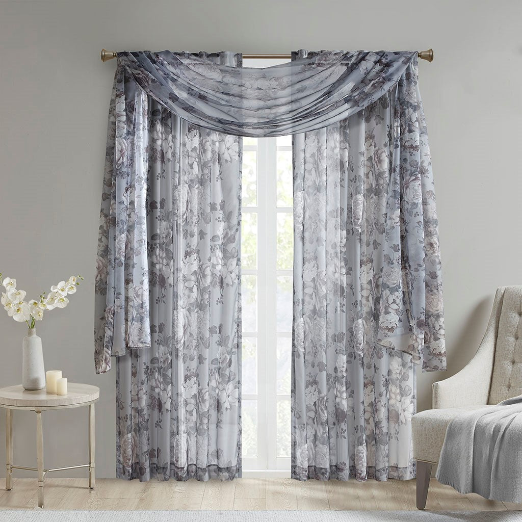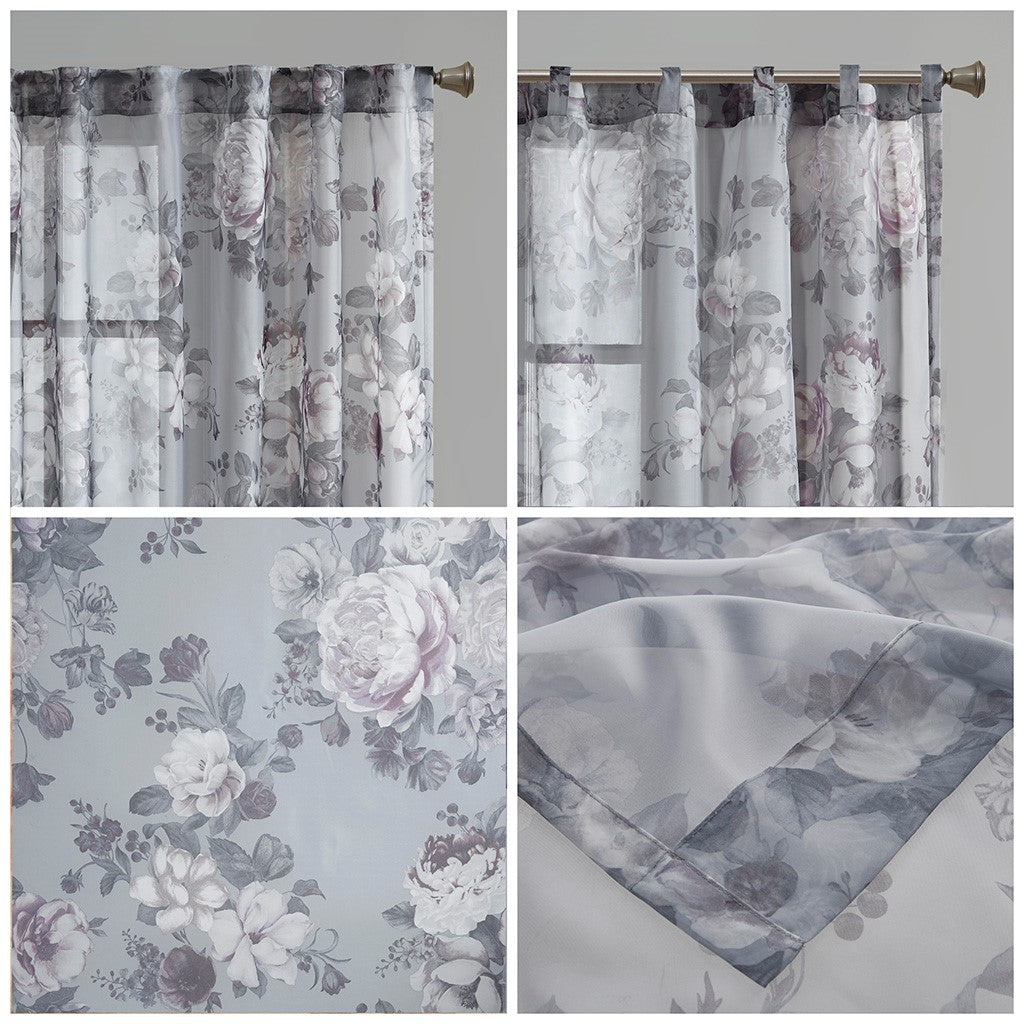 Simone Printed Floral Rod Pocket and Back Tab Voile Sheer - Grey - 50x84"