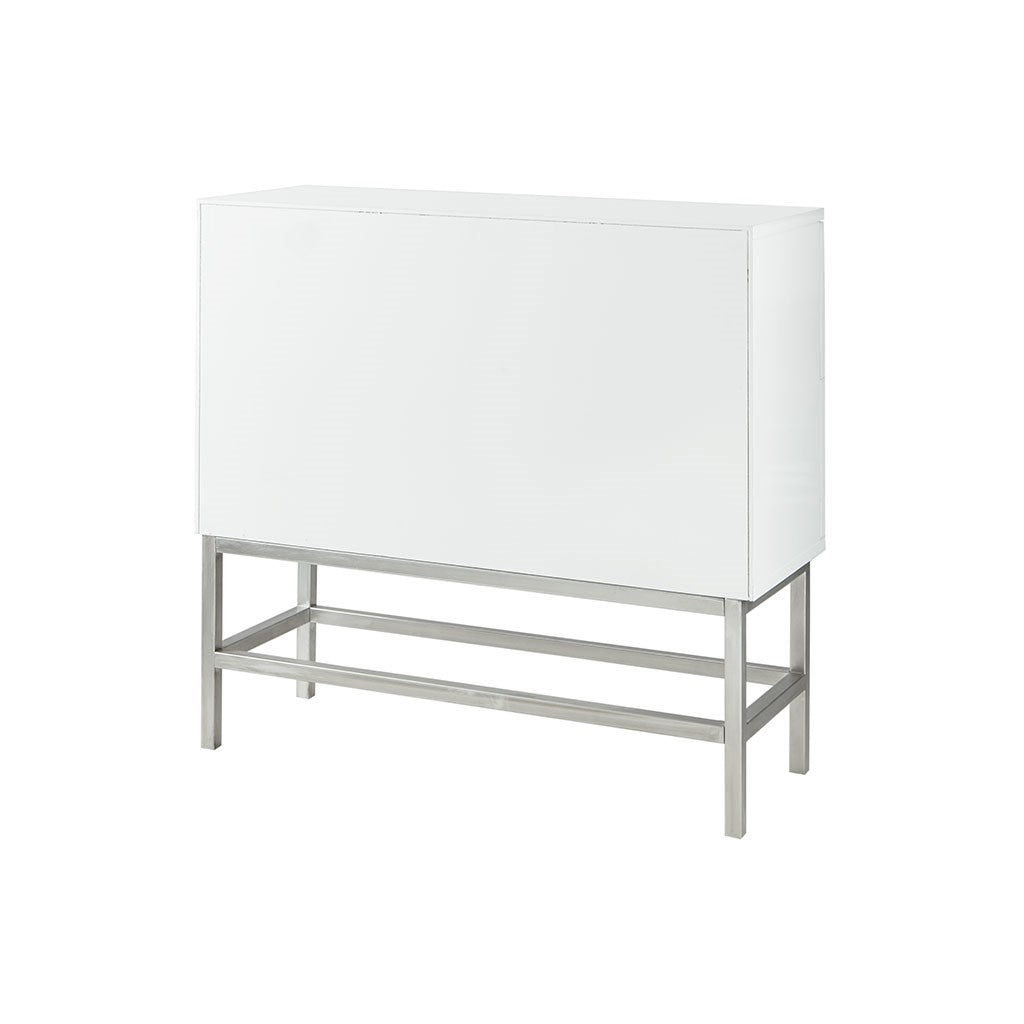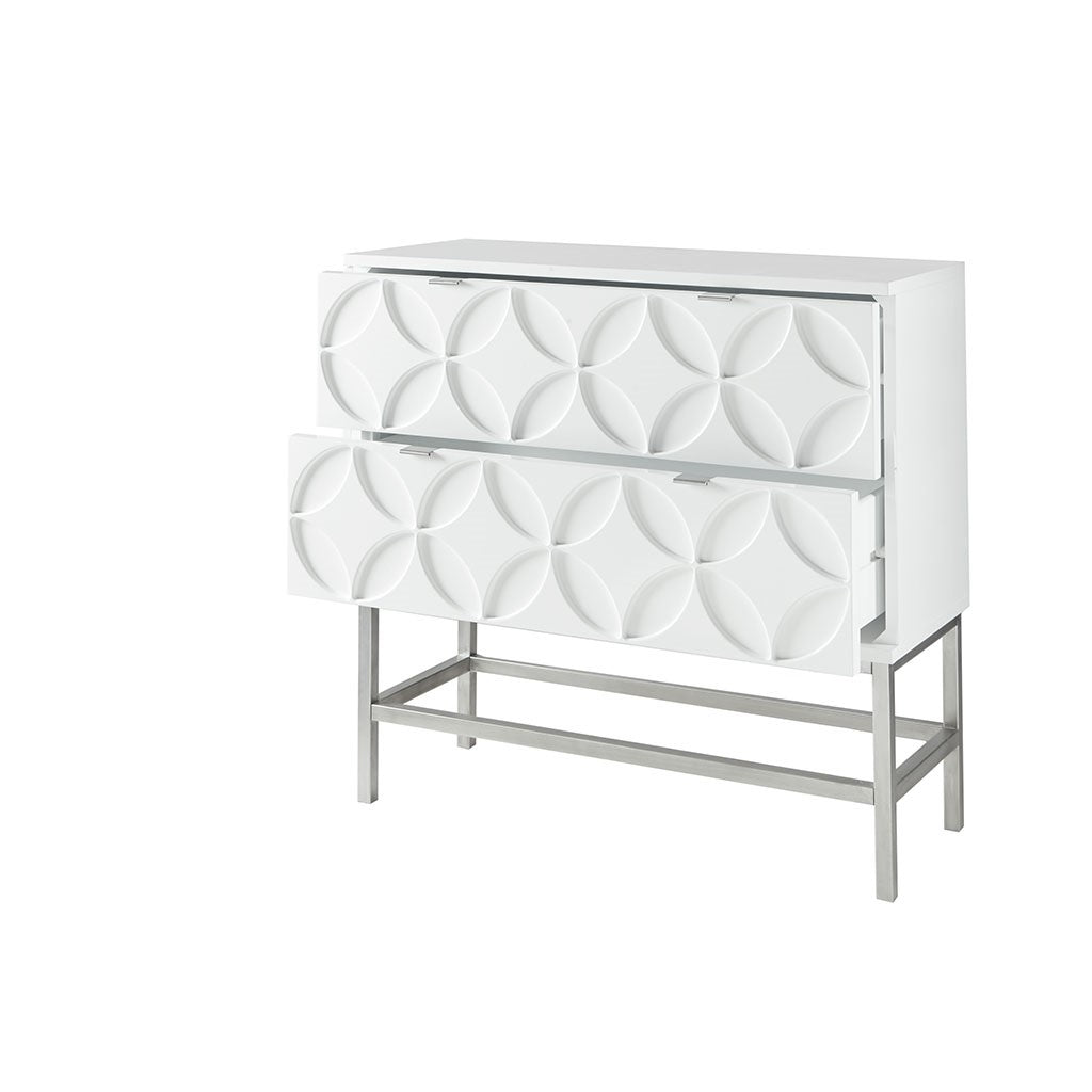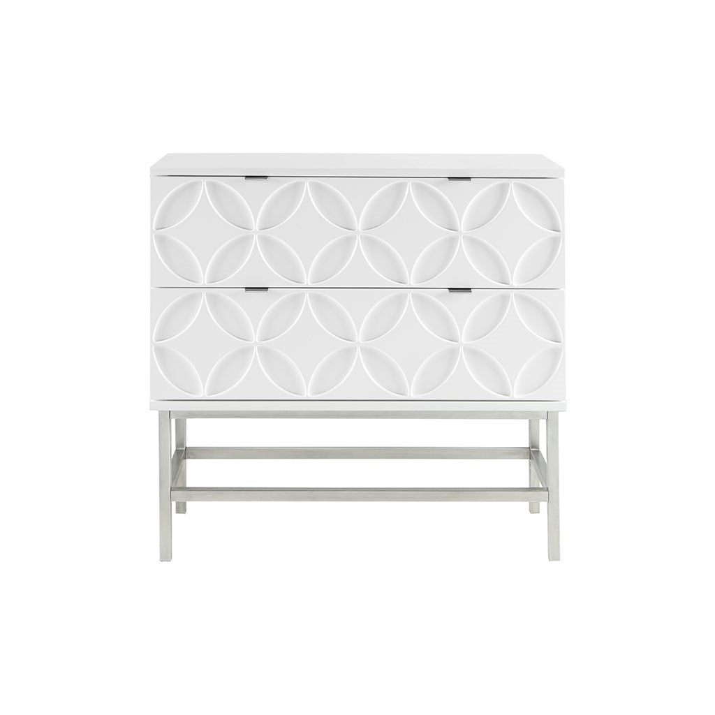 The Madison Park Sonata 2 Drawer Accent Chair offers a modern touch to your space. This accent chest flaunts a manufactured wood frame with a high gloss white finish and a brushed silver finish on the straight metal legs, for a chic contemporary look. Each drawer features a wood glide and an edge pull handle to easily and smoothly open and close. A geometric design is displayed on the two drawers, adding dimension and charm to the design. With a stunning design, this two drawer accent chest fits perfectly in any transitional decor and gives your home a modern flair. Assembly is required.