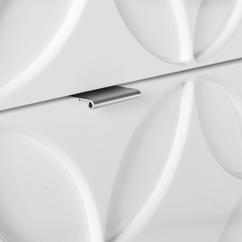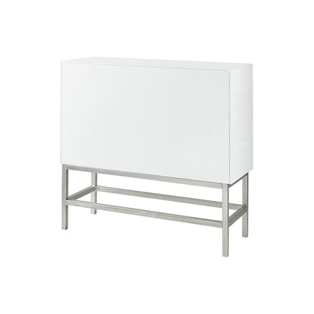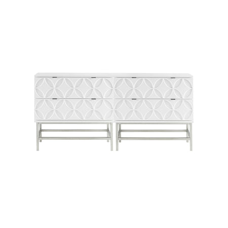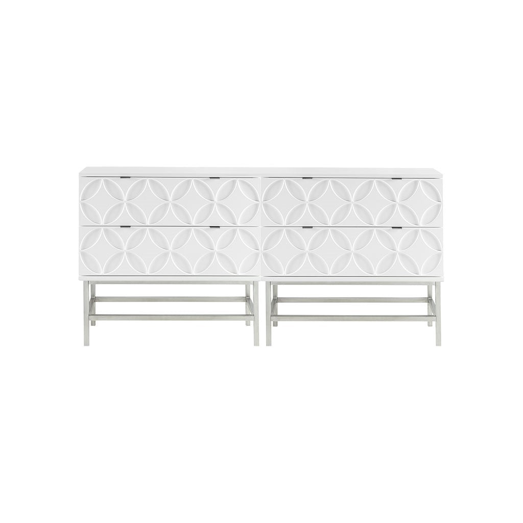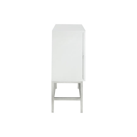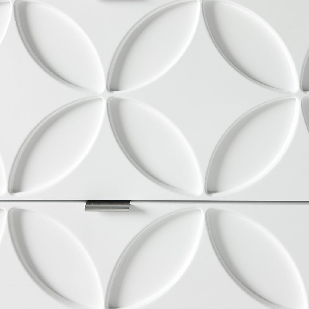 The Madison Park Sonata 2 Drawer Accent Chair offers a modern touch to your space. This accent chest flaunts a manufactured wood frame with a high gloss white finish and a brushed silver finish on the straight metal legs, for a chic contemporary look. Each drawer features a wood glide and an edge pull handle to easily and smoothly open and close. A geometric design is displayed on the two drawers, adding dimension and charm to the design. With a stunning design, this two drawer accent chest fits perfectly in any transitional decor and gives your home a modern flair. Assembly is required.