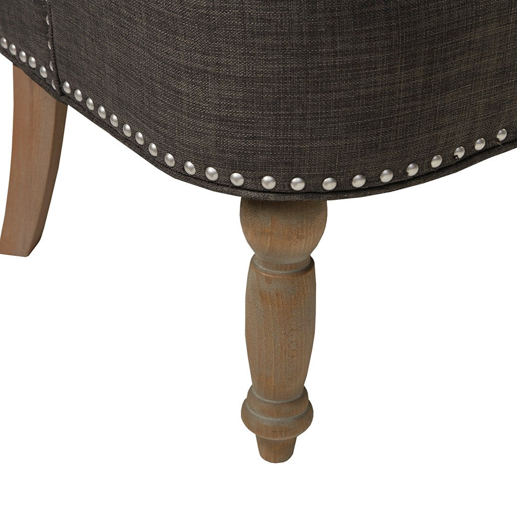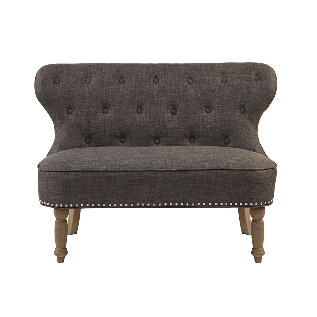 Elevate your living room decor with the sophisticated style of the Madison Park Stanford Settee. Featuring an elegant button-tufted back, this settee is upholstered in a charcoal fabric with a pewter nailhead trim for a chic transitional look. Solid wood legs provide a sturdy base and perfectly complement the upholstery. Add a unique and eye-catching style to your home by incorporating this settee into your living space. Leg assembly required.
