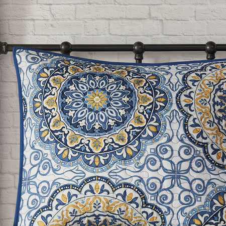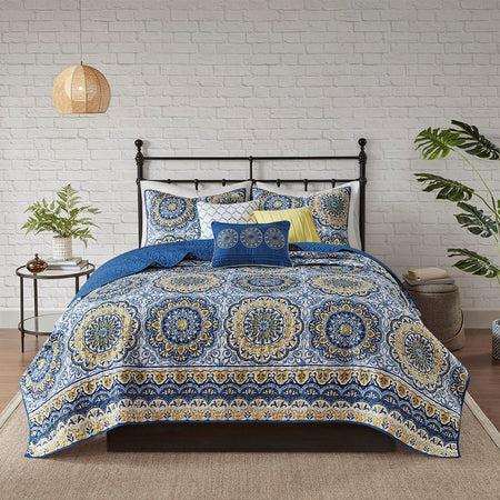 Tangiers 6 Piece Reversible Coverlet Set instantly adds color and flair to your bedroom. Its bold blue and yellow floral print with large medallions is a modern twist to a classic look. The embroidered detailing on the three decorative pillows pulls the whole look together. This coverlet set also includes two matching king shams. With a microfiber polyester face and a brushed fabric reverse, this coverlet is soft to the touch and machine washable for easy care.
