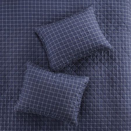 The navy reverse showcases a clean and inviting all-over windowpane print to complement the top of the coverlet. Zipper closures on the 2 matching reversible shams create a clean finished edge, while cotton-rich filling and channel quilting provides a soft hand feel.