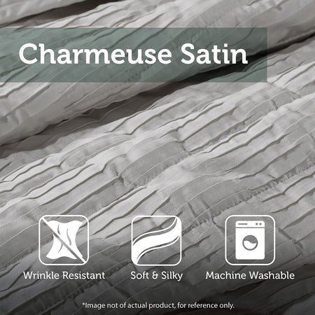 - Comforter is made from 100% polyester charmeuse with a slight shine to the fabric