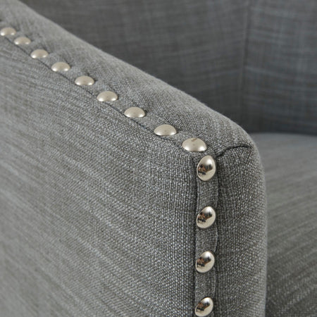 Relax in the comfort and elevate your living room with the Madison Park Tyler Swivel Chair. Upholstered in a rich grey fabric, this swivel chair features silver nail heads that line the arms and back for an elegant touch. The curved design creates a luxurious silhouette, while the high-density foam cushion provides a deep and comfortable seat. The swivel feature allows the lounge chair to rotate 360 degrees on its black metal base. No assembly required.