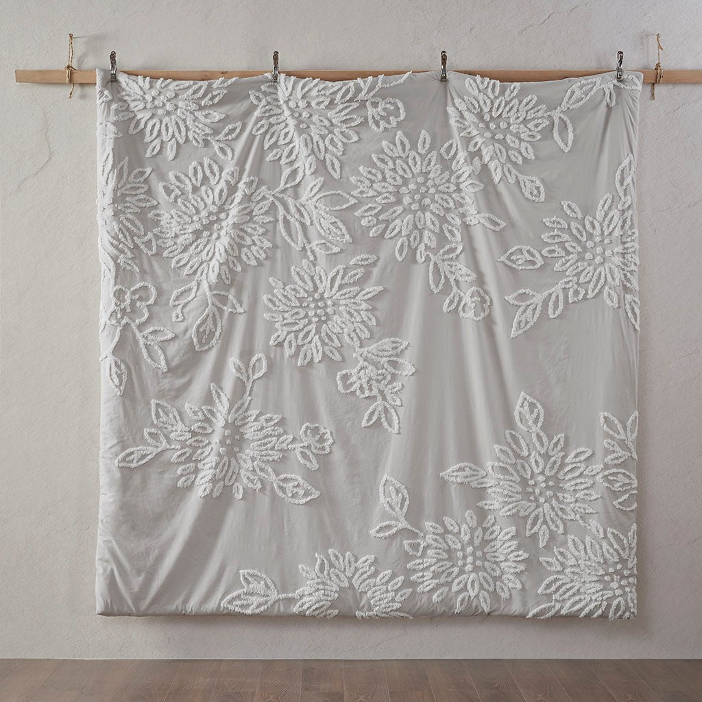Veronica 3 Piece Tufted Cotton Chenille Floral Comforter Set - Grey / White - Full Size / Queen Size