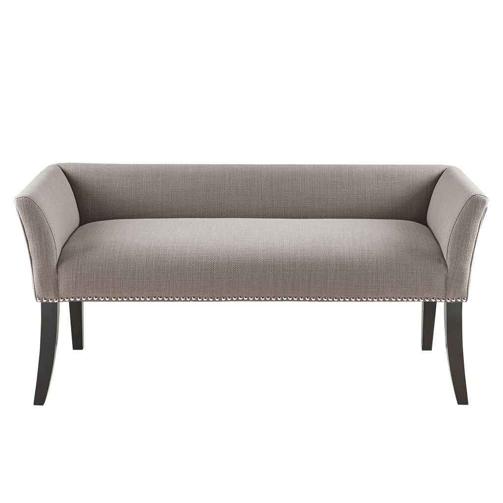Accent your home with the simple elegance of the Madison Park Welburn Accent Bench. Upholstered in a grey fabric, this bench features a low back and flared arms that create a sleek and sophisticated look. A bronze nailhead trim adds elegant accent, while the light wood finish complements the upholstery. Perfect for your bedroom or living room, this upholstered bench provides a chic update to your home decor. Assembly required.