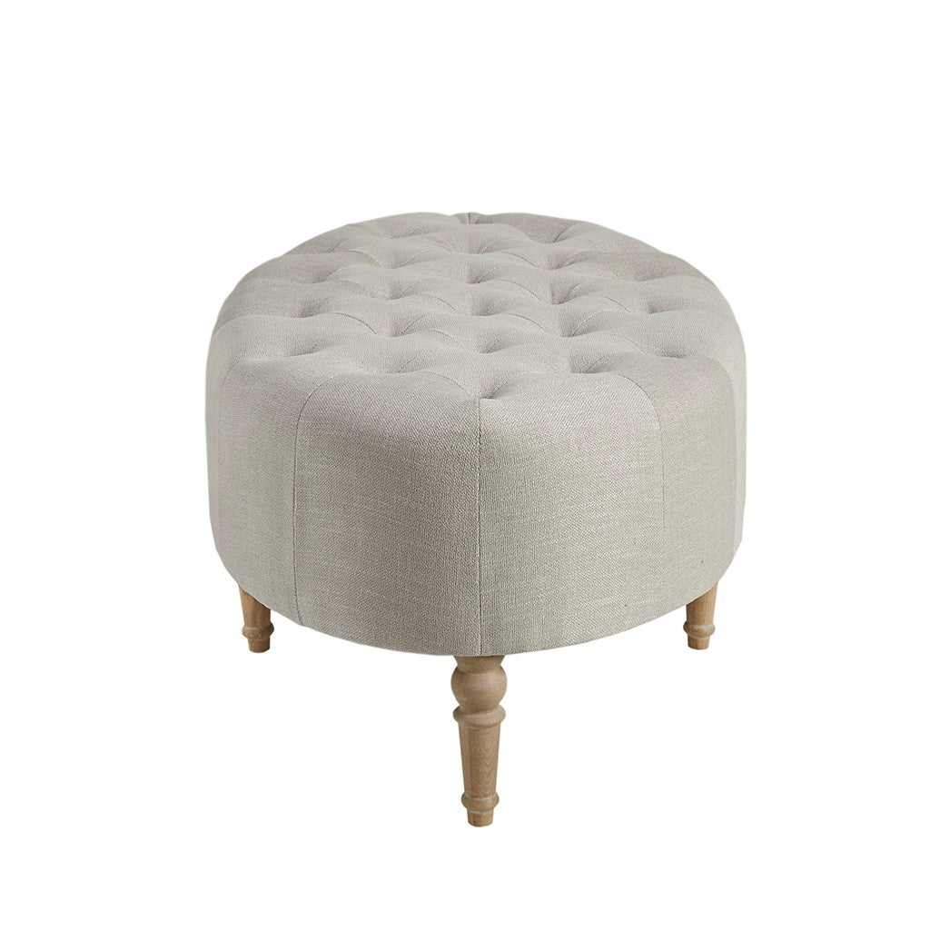Created exclusively for the Martha Stewart Bedford furniture collection that embodies country farmhouse living, complete your living space with the Clara Accent Ottoman. This oval ottoman is upholstered in a linen-hued fabric and features a button-tufted top that adds an elegant accent to the design. The solid wood legs screw in and showcase a reclaimed natural wood finish to complement the upholstery, creating a farmhouse-inspired look. At her country farmhouse, Martha enjoys bringing the outdoors in. This functional and practical lifestyle is evidenced in her thoughtfully appointed decor which embraces a neutral color palette that acts as a perfect backdrop to four seasons of color. Leg assembly required.